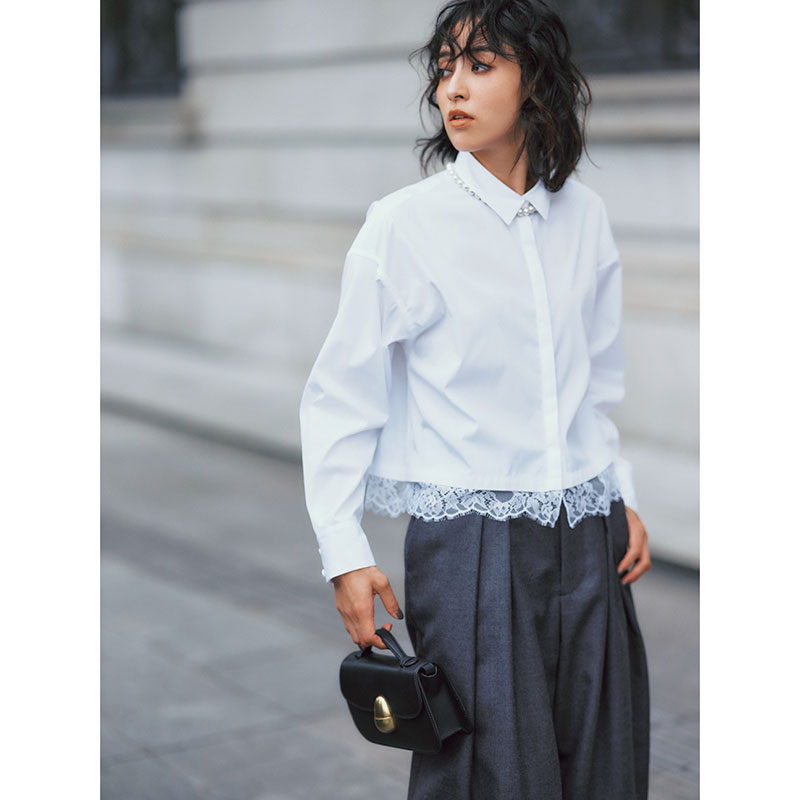 パールネックレス¥10,450(スクランチーズバック/サードマガジン)シャツ¥29,700(サードマガジン)パンツ¥46,200(サクラ/インターリブ)バッグ¥165,000[参考価格](ネオス/ザ・ウォール ショールーム)