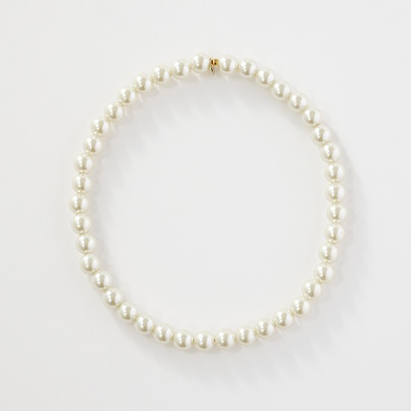 王道のパールを少しだけインパクトのある大きさにするだけで、コンサバな中にもモード感のある装いに仕上がります。伸縮性があるので、シャツの衿の外からつけられちゃう便利さが魅力。ワンサイズ展開。