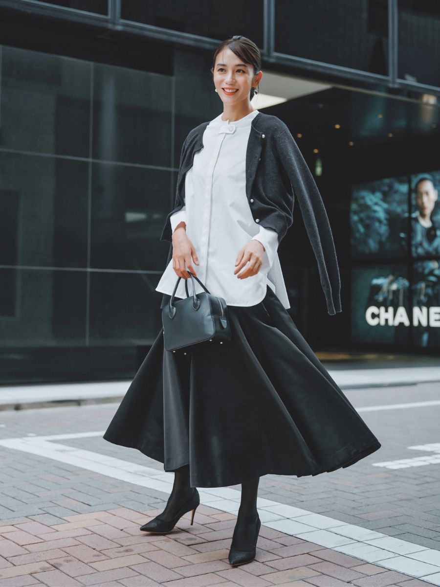 フレアスカートにはコンパクトトップスやウエストインが定番でしたが、少し長めのトップスをアウトしたバランスが今っぽい。前開きシャツなら下の子の授乳問題もクリアできます。ブラウスはヨリ、スカートはデ・プレ、カーディガンはプロタゴニスタ、バッグはメゾン カナウ、靴はツル バイ マリコ オイカワのもの。