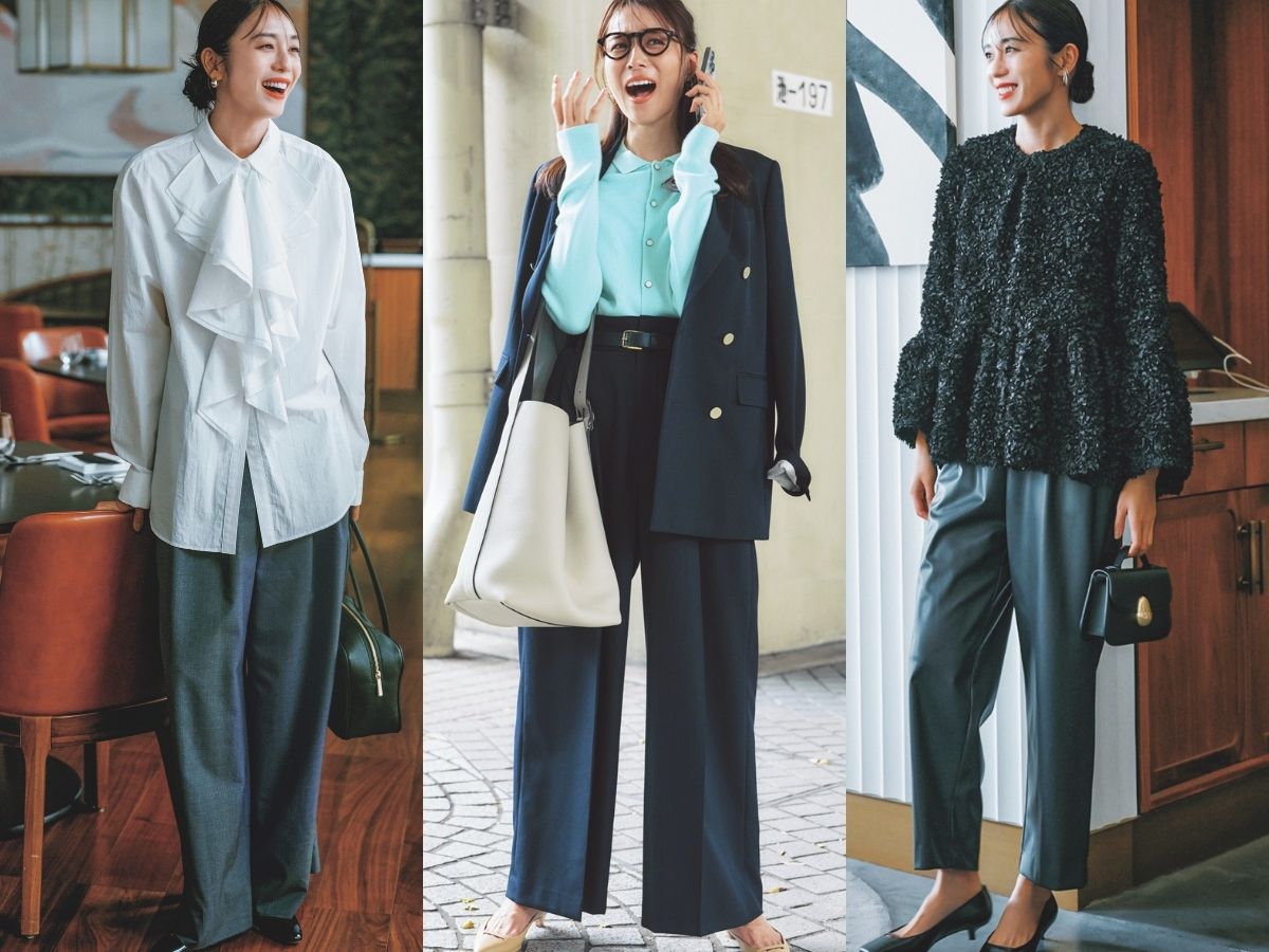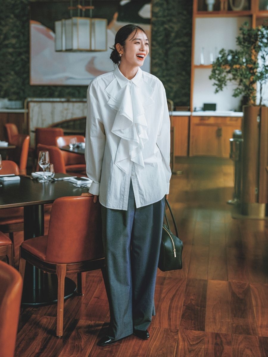 コンサバ服といえばフィットアンドフレアシルエットのイメージがありますが、上下ゆったりもあり。ドレッシーな大胆フリルなど、モードっぽく着られるブラウスを合わせればゆるパンツでもオケージョンスタイルに! ヒールのほかに、ローファーのようなフラットシューズが似合うのも心強い。ブラウスはプランクプロジェクト、パンツはエイトン、バッグはモフィオラ、靴はペリーコのもの。