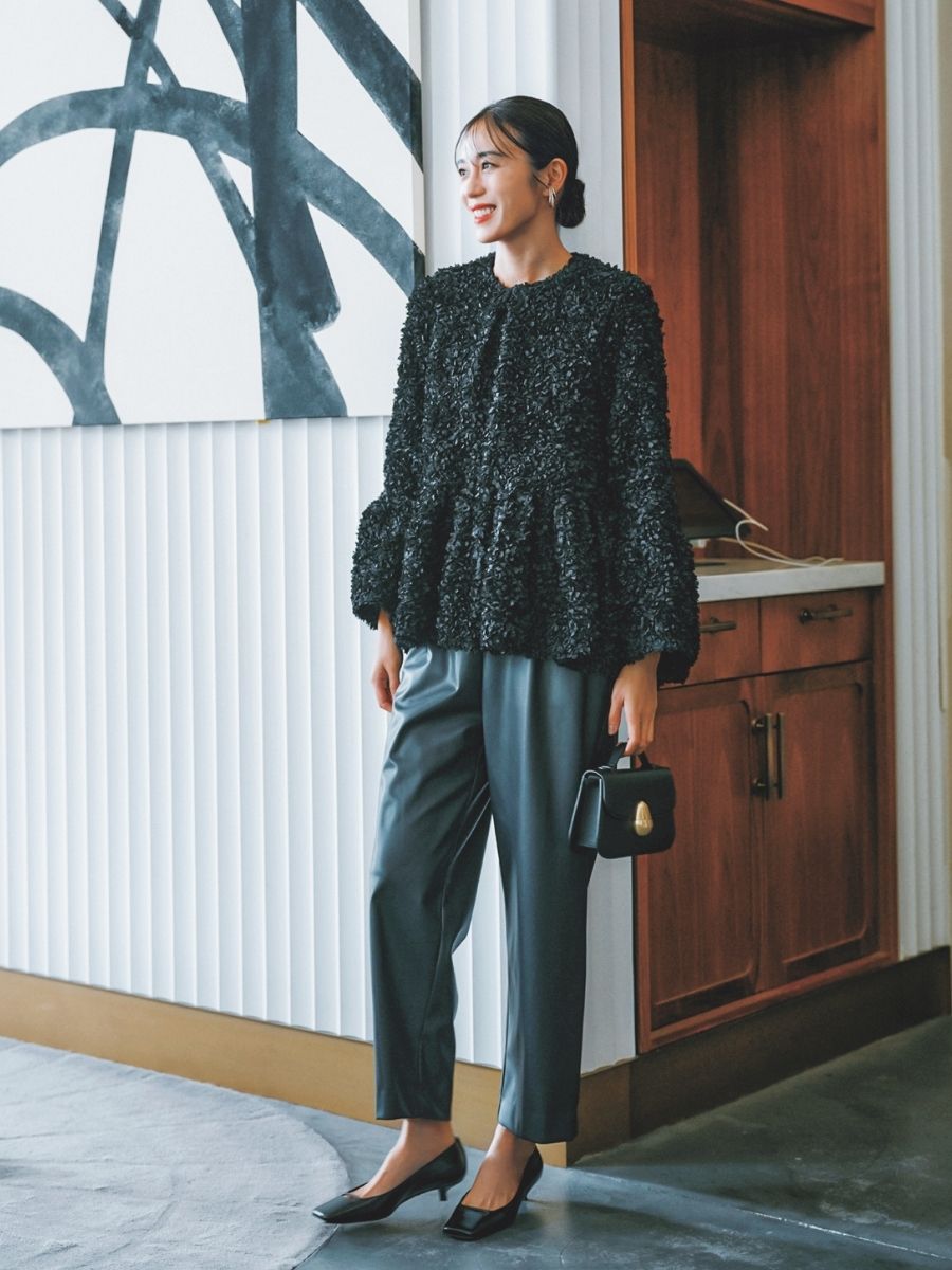 楽ちんかつ着映えするフレアシルエットのトップス+細身パンツの組み合わせ。お腹やお尻周りもふんわりカバーしてくれます。ジャカードなどのラグジュアリーな生地を選べば、より特別なスタイルに。ブラウスはツル バイ マリコ オイカワ、パンツはヨリ、バッグはネオス、パンプスはペリーコのもの。