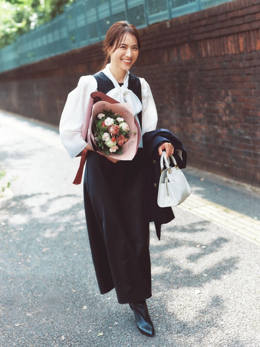 マタニティにもおすすめなワンピースonブラウススタイル。シンプルなワンピースも、甘ブラウスで衿や袖に華やかさをプラスすれば特別感アップ。パンプスではなく、あえてのブーツを合わせてこなれた印象に。ワンピースはマリハ、ブラウスはエブール、バッグはJ&M デヴィッドソン、ブーツはネブローニのもの。