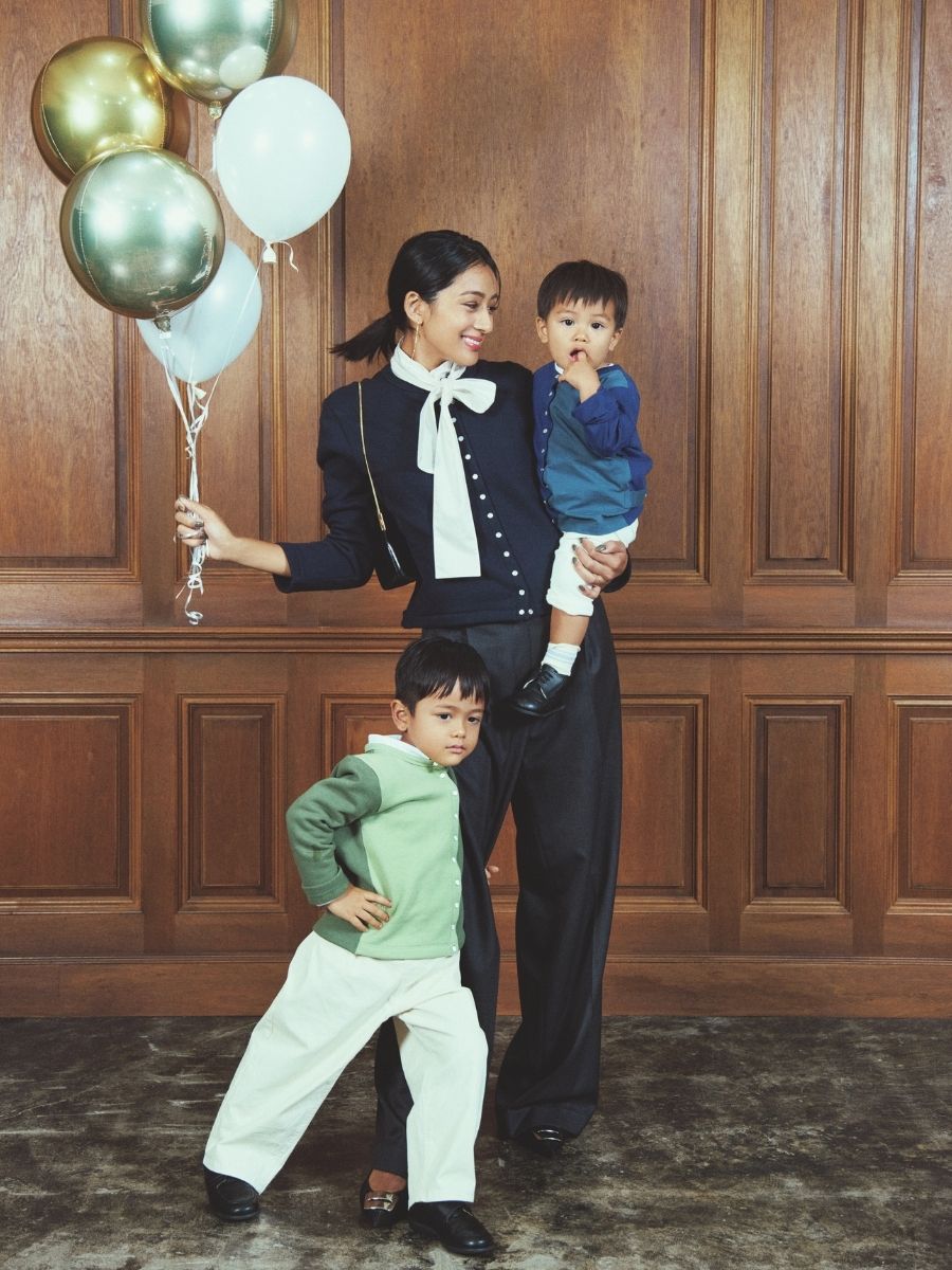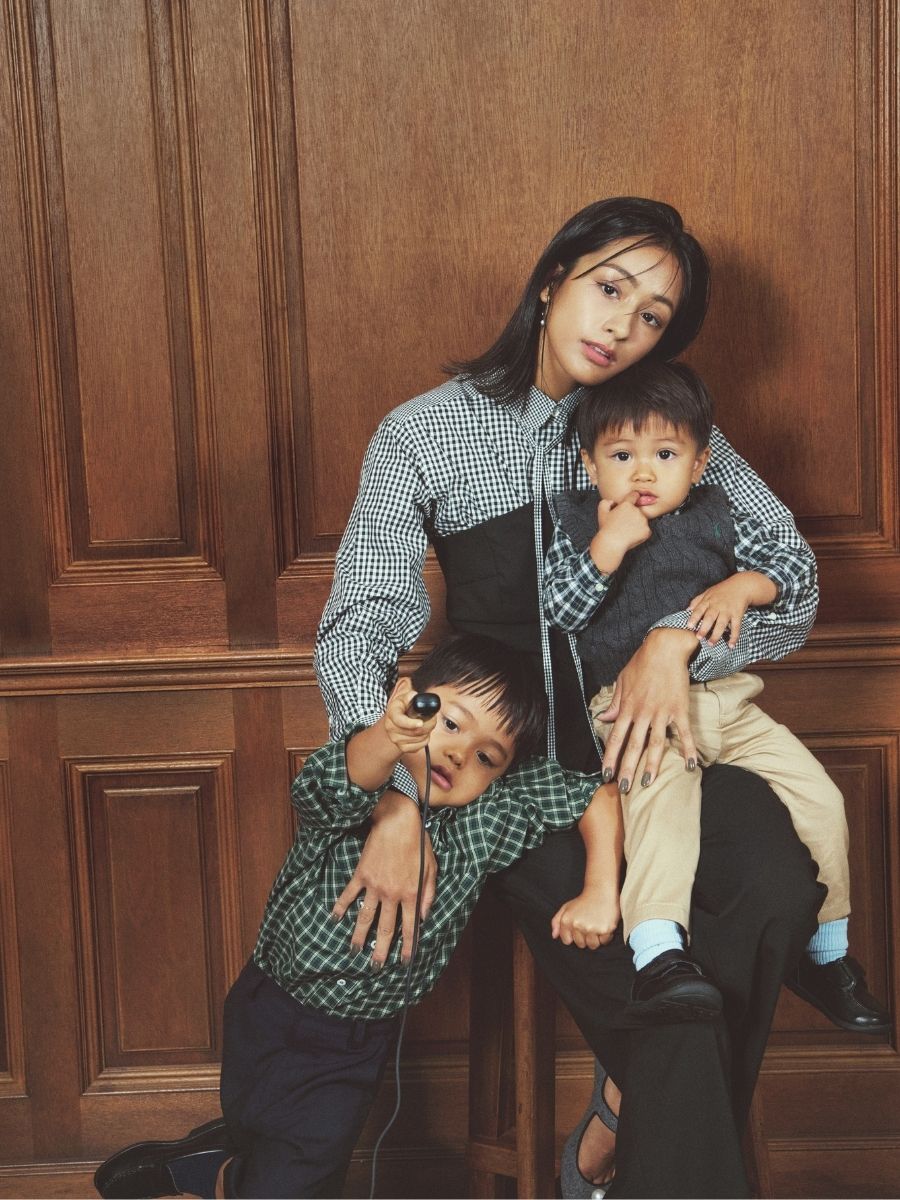 シックな色味でも華やかさのあるギンガムチェックは、チェックシャツとリンクコーデもできるので男の子ママのオケージョン服におすすめ。ビスチェをプラスすれば、チェックシャツもエレガントな印象に仕上がります。シャツはインターナショナルギャラリービームス、ビスチェとパンツはソブ、靴はピッピシックのもの。