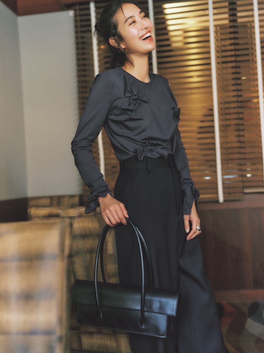親もお手伝いで忙しい発表会は、動きやすさ重視の黒子スタイルがマスト。華やかさが出る立体デザインのトップスやシアー素材のトップスなら、上下黒でもしっかりハレの日ムードに。トップスはプランクプロジェクト、パンツはロエフ、バッグはモフィオラのもの。