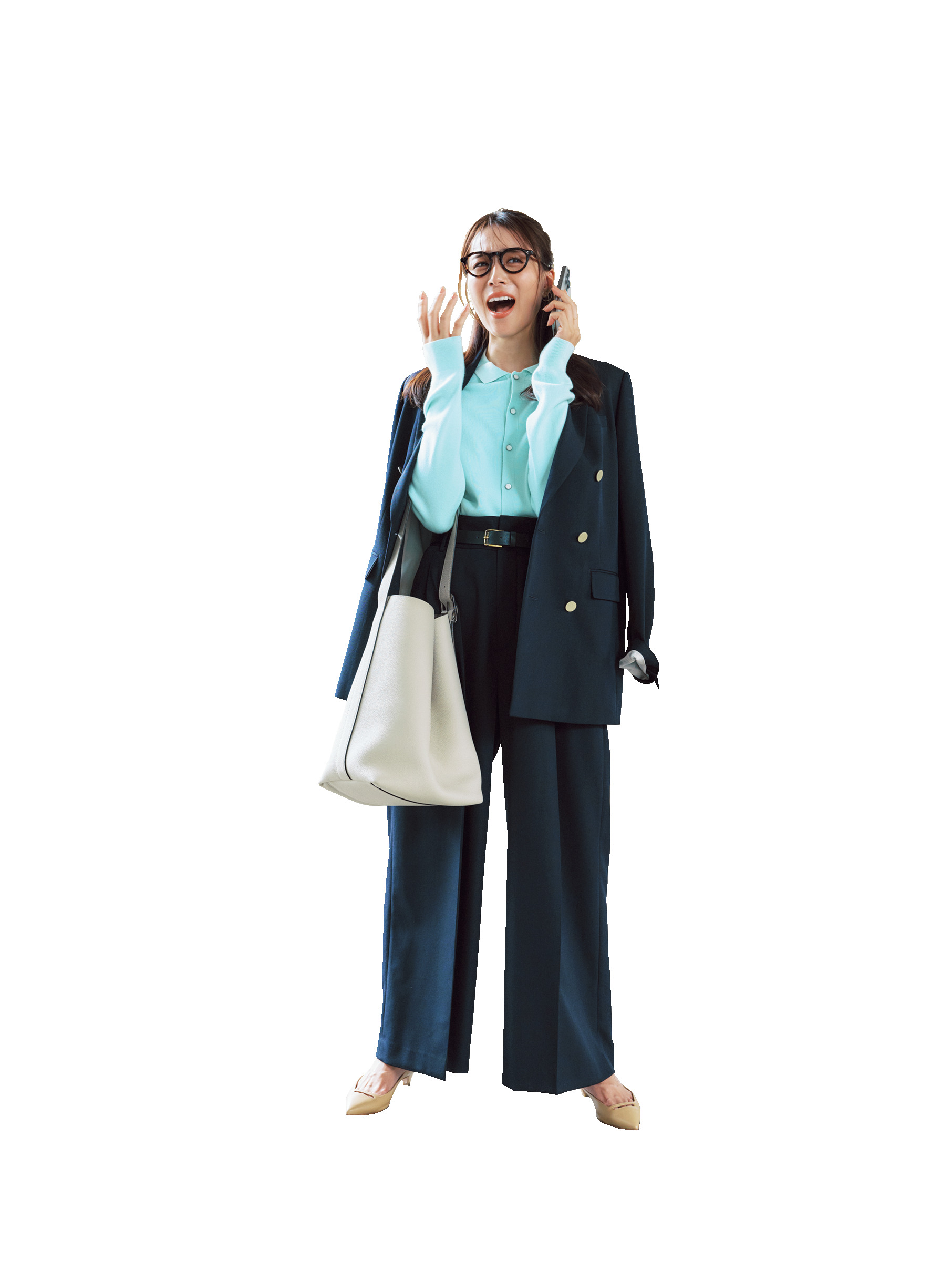 ジャケットにシャツ感覚でインするのはトレンドの衿付きニット。キレイ色を選べば華やかさがアップして、パンツスーツが新鮮に! 手持ちのセットアップで気軽にトライできます。ジャケットとパンツはアンクレイヴ、ポロカーディガンはキャバン、バッグはボナベンチュラ、靴はペリーコのもの。