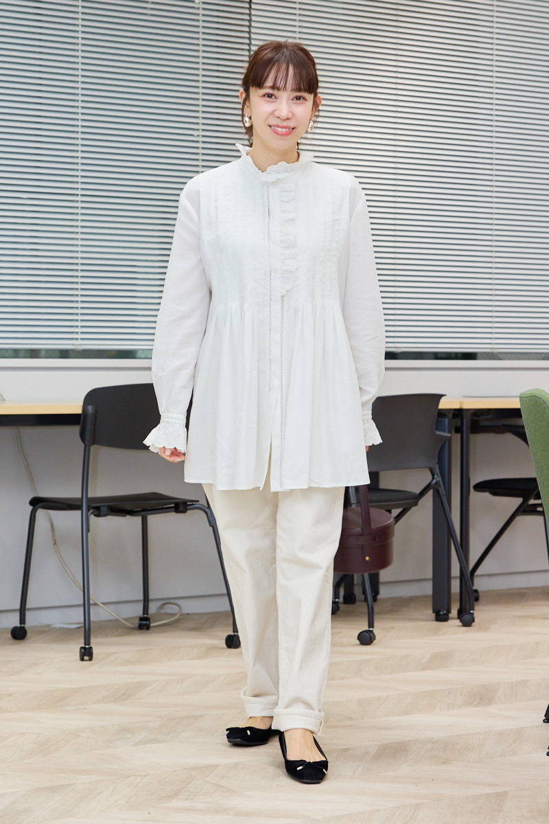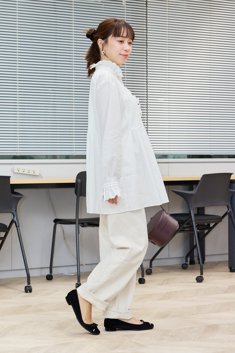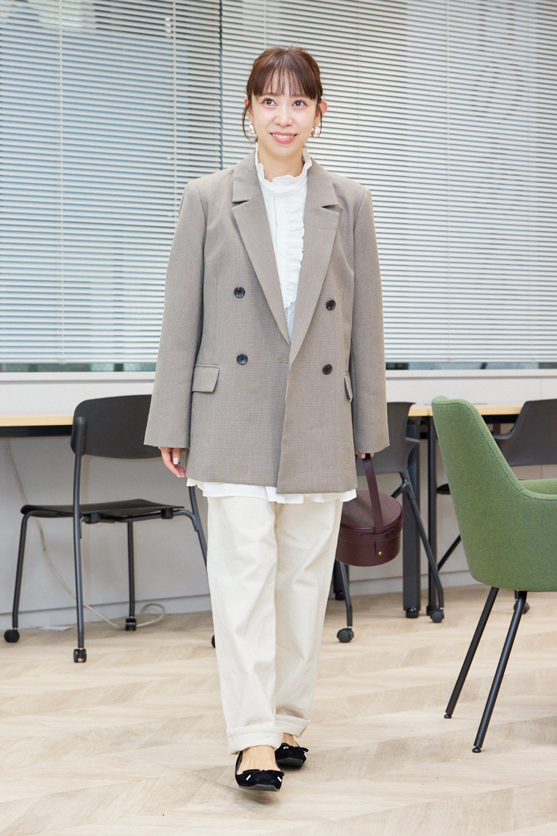 オシャレに見えるワントーンコーデが気分で、ホワイトデニムに白ブラウスを合わせて着てみました。グレージュのジャケットや小物で季節感をプラス。白の比率が高いので、きれいめなお仕事シーンや、かっちりめのランチ会に着て行きたいです。中に着たブラウスは、繊細なフリルが首元や袖口から見えるのがポイント。これだけで、ジャケット×デニムの王道コーデをぐっと優しい雰囲気にしてくれます」編集菅原圭絵・35歳(152cm/5歳の女の子ママ)