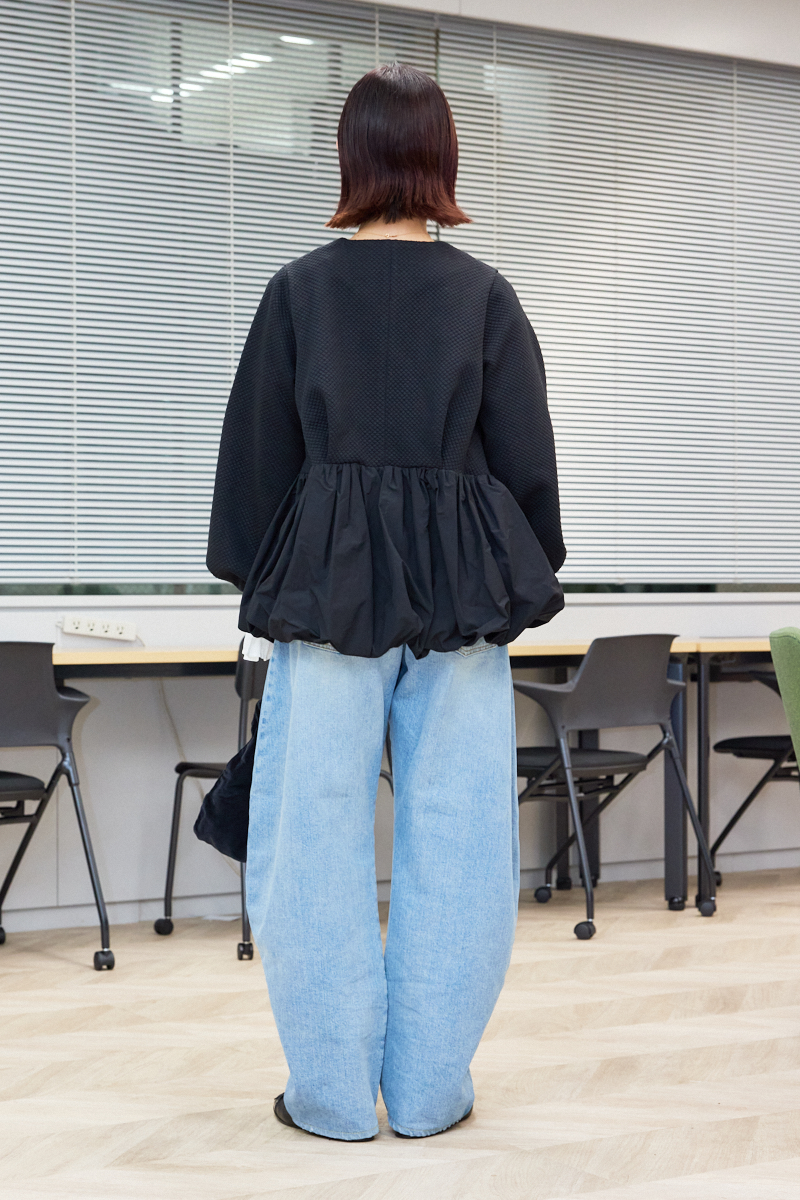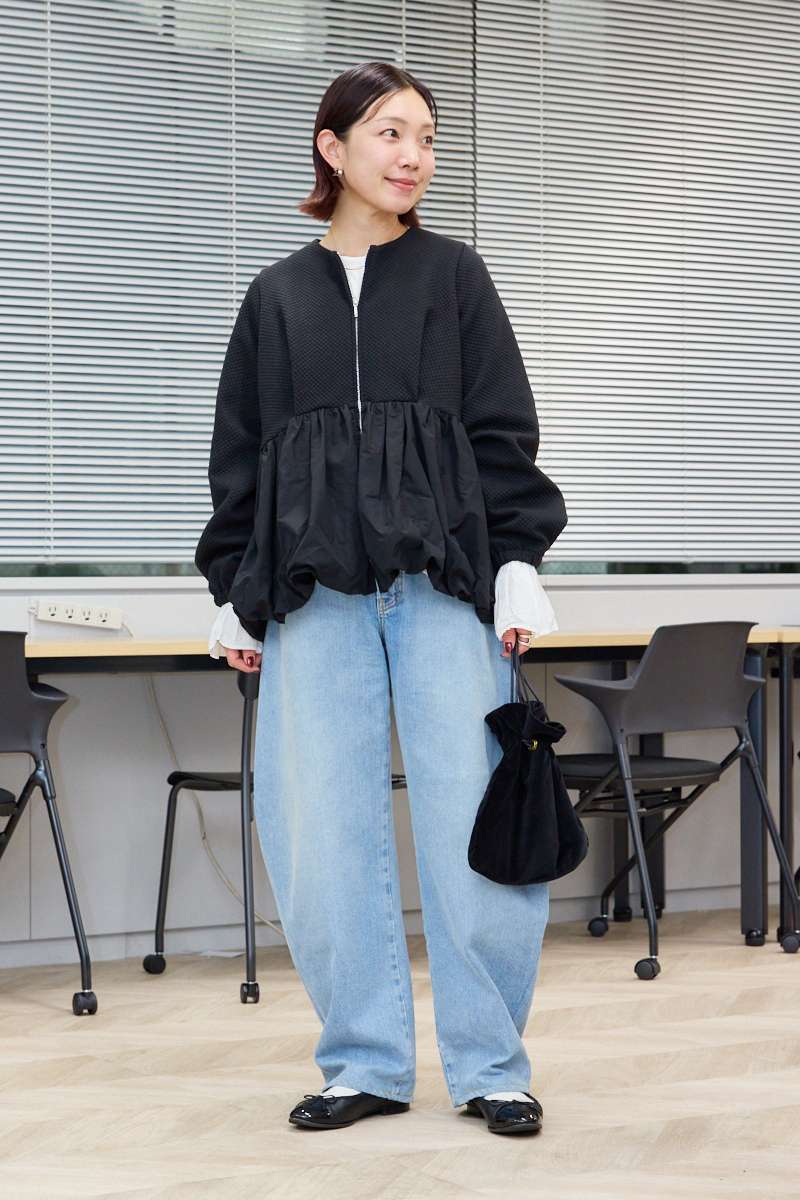 「大胆なカーブデザインのデニムは、穿くだけで旬なスタイルが叶うお気に入りアイテム。平日のママ友とのランチや、仕事で読者さんと会うときなどに穿くことが多いです。合わせたブルゾンはペプラム部分がアクセントになり、羽織るだけでこなれて、使い勝手◎。デニムにはもちろん、きれいめなアイテムとも相性がいいので、合わせ方で次第でいろんなシーンで着られそう。黒のボトムスやスカートと合わせれば学校行事にもバッチリですね」ライター高萩里奈さん・39歳(165cm/11歳、7歳の女の子ママ)