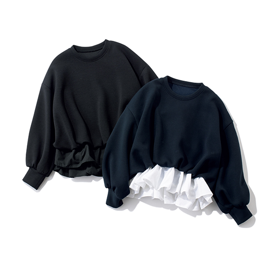 「自転車送迎や幼稚園後の公園遊びなど、寒くても外に出ることが多く、週4はデニムで過ごしているかもしれません。送迎や外遊びではキャップを被ることも多いので、どうしてもカジュアルになってしまうのですが、どこかにオシャレ見えするポイントを入れるようにしています。このトップスは動きやすいスウェットながら、ドッキングされたフリルで甘さが出るのがうれしい。ゆったりとしたサイズともちもちの着心地が気に入っています」ライター島田有香・35歳(155cm/6歳の男の子と4歳の女の子ママ)