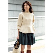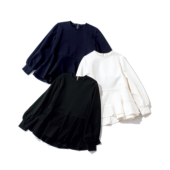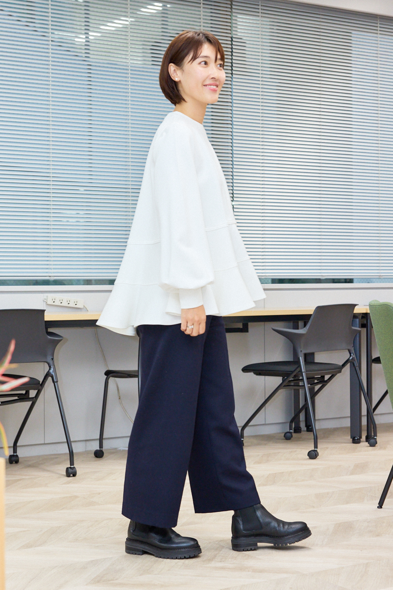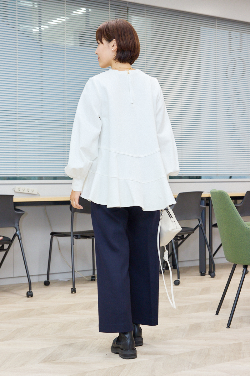 「コーデの主役になる白のペプラムトップスはモノトーンコーデでも華やかになり、ワンツーで決まるのがうれしいです。360度どこから見てもきれいなシルエットなのに、裏起毛になっていて暖かさもあり、これからの時期にもぴったり。コートの中はこれ1枚で十分です」ライター小川理蓉さん・36歳(158cm/8歳、7歳、3歳の男の子ママ)
