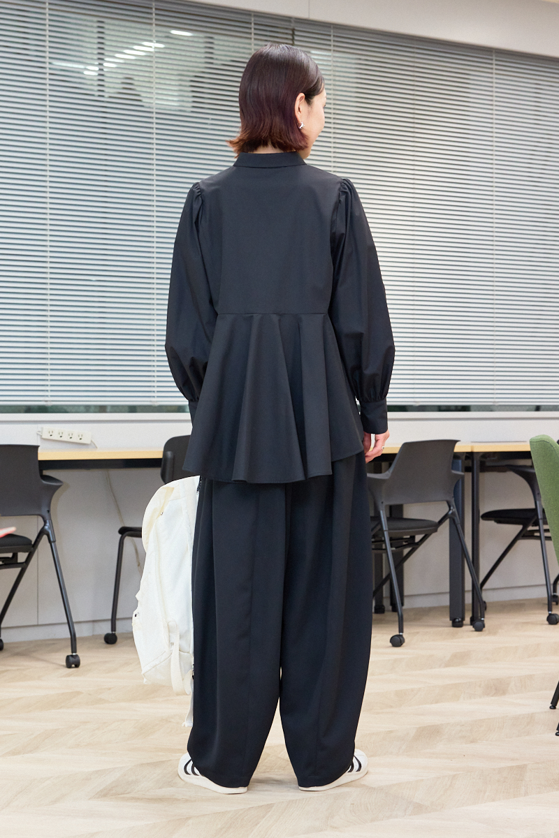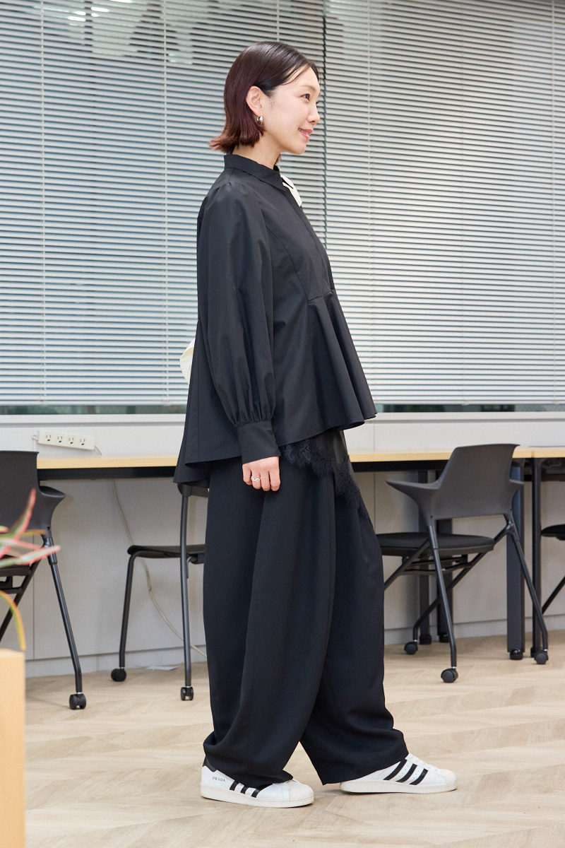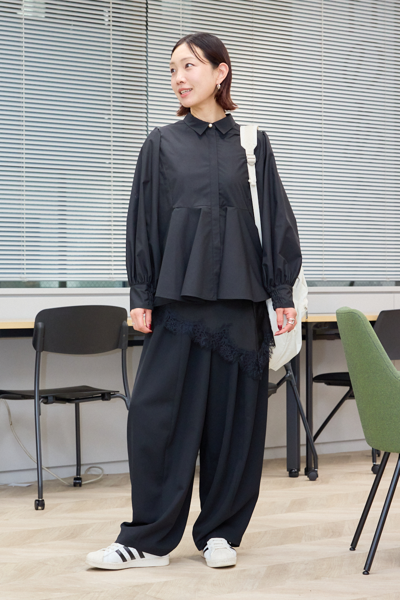 「ペプラムになっているのが新鮮な襟付きの黒ブラウスは、タックがたくさん入っていて後ろ姿も美しく見せてくれる気がします。真冬でも室内に入ると暑いので、私はニットよりブラウスやシャツ派。ややゆとりのあるサイズで、中にインナーを仕込めば違った着こなしも楽しめそう。仕事や園行事にも着られます」ライター高萩里奈さん・39歳(165cm/11歳、7歳の女の子ママ)