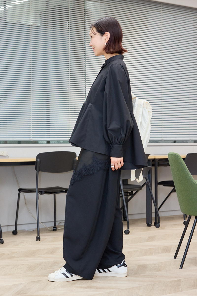 オールブラックでも軽やかな印象に