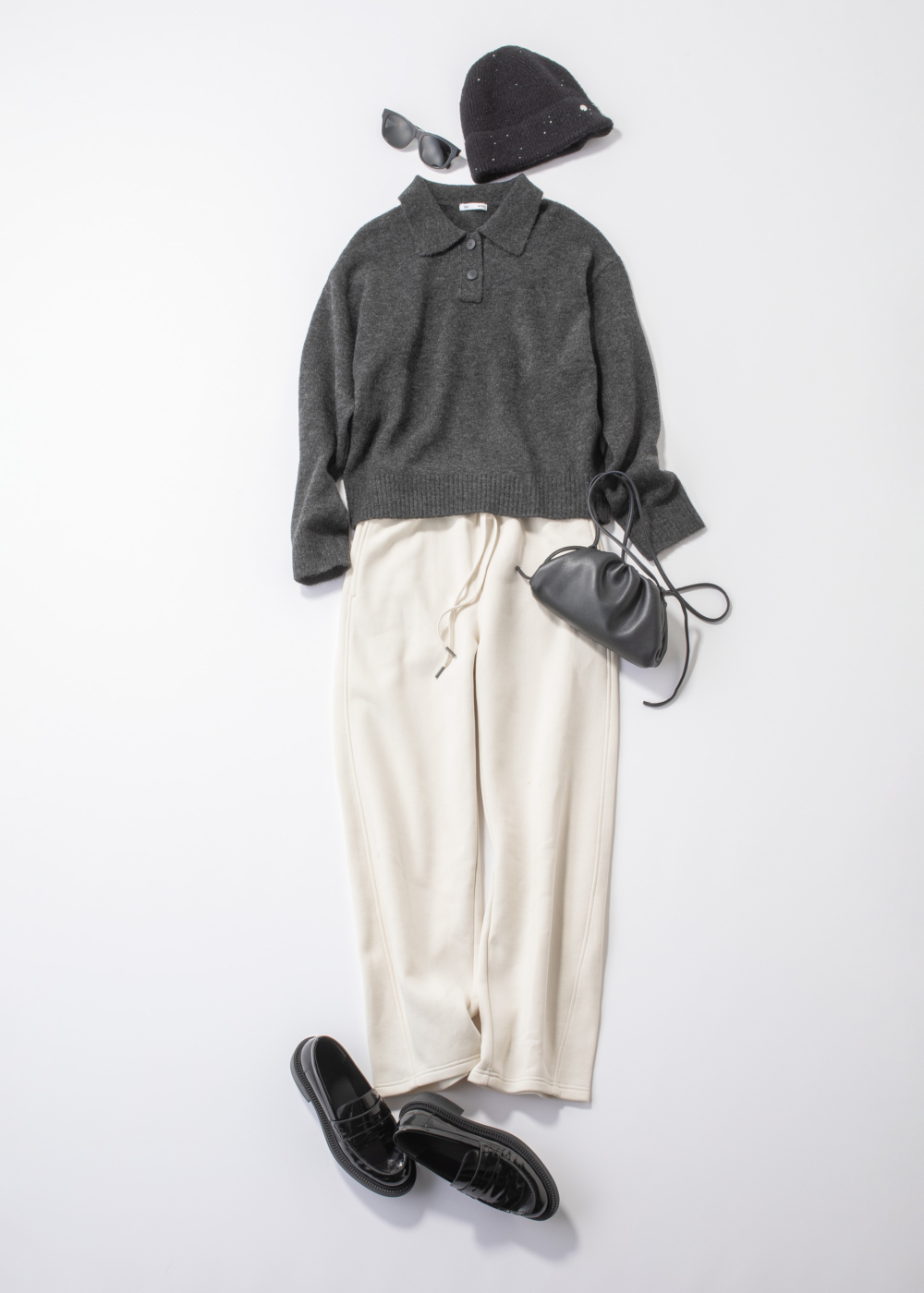 スウェットパンツと合わせたトレンドコーデでこなれ感抜群! 足元は、ローファーで「いい子」に締めるのも手。パフニットポロシャツ¥2,490パンツ(ともにGU)その他・ライター私物