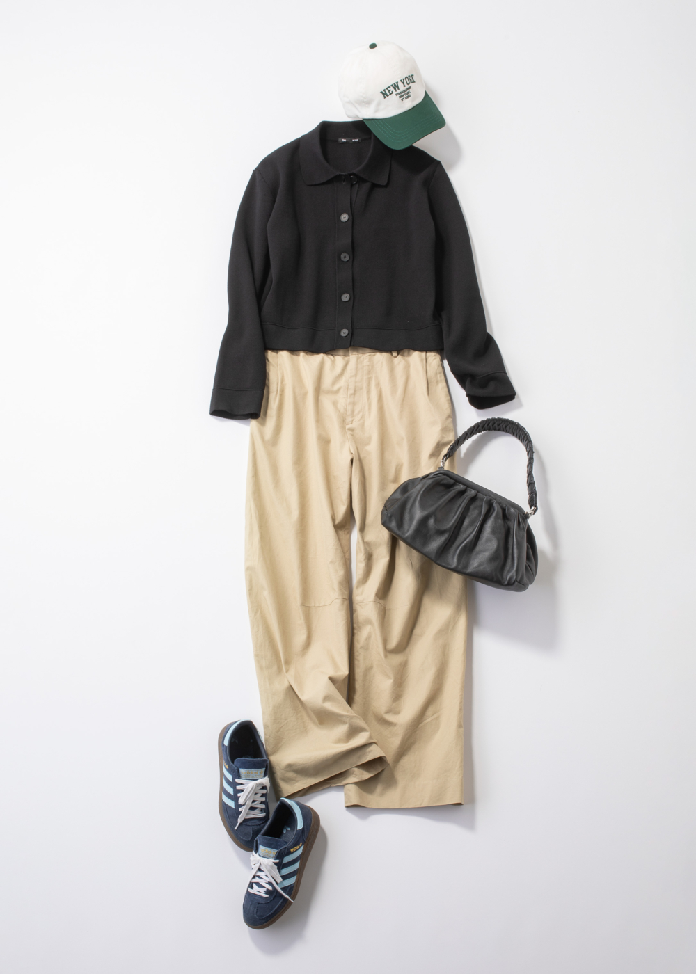 チノパンやスニーカーでカジュアルダウンさせるのもおすすめ。寒い日は下にタートルを仕込むのも良さそう! ミラノリブポロカーディガン¥2,990キャップ(ともにGU)その他・ライター私物