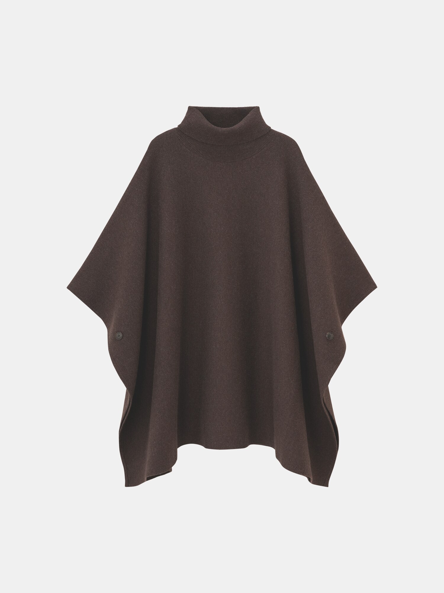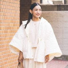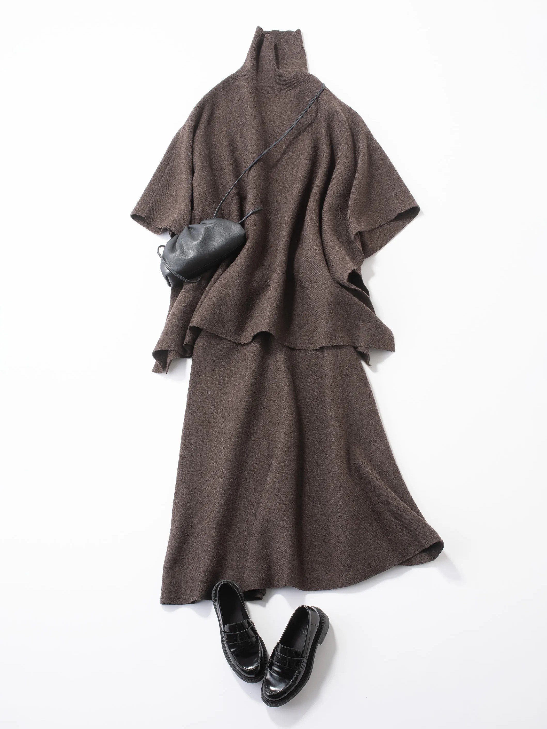 上下セットで着ると、Aラインワンピのようなボリュームのあるシルエットを楽しめます。トップスもスカートも目の細かいハイゲージ編みなので着膨れせず、スタイリッシュに着こなせるのがポイント。メリハリをつけたいときは、ウエスト位置でシャツを巻いたり、長めのネックレスを合わせると◎。ウールコットンブレンドポンチョセーター¥17,000ウールコットンブレンドフレアスカート¥13,000ローファー(すべてプラステ)