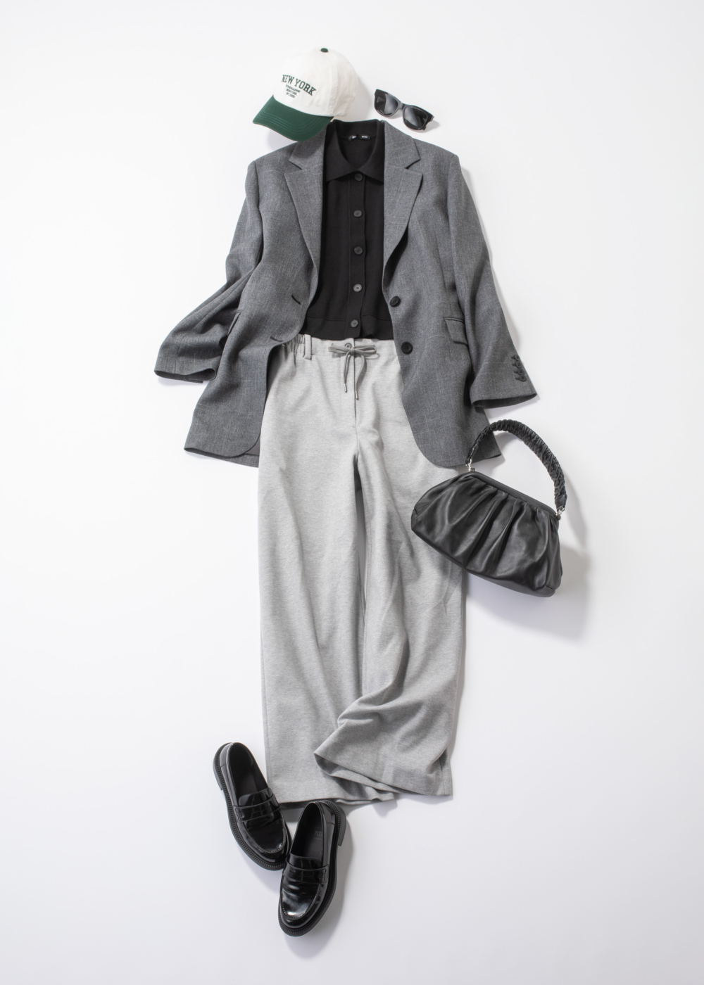 テーラードジャケットとニットポロのレイヤードも今っぽさ抜群! グレーから黒でまとめるのが大人っぽく見える理由です。オーバーサイズテーラードジャケット¥24,000ニット、パンツ、ローファー(すべてプラステ)その他・ライター私物