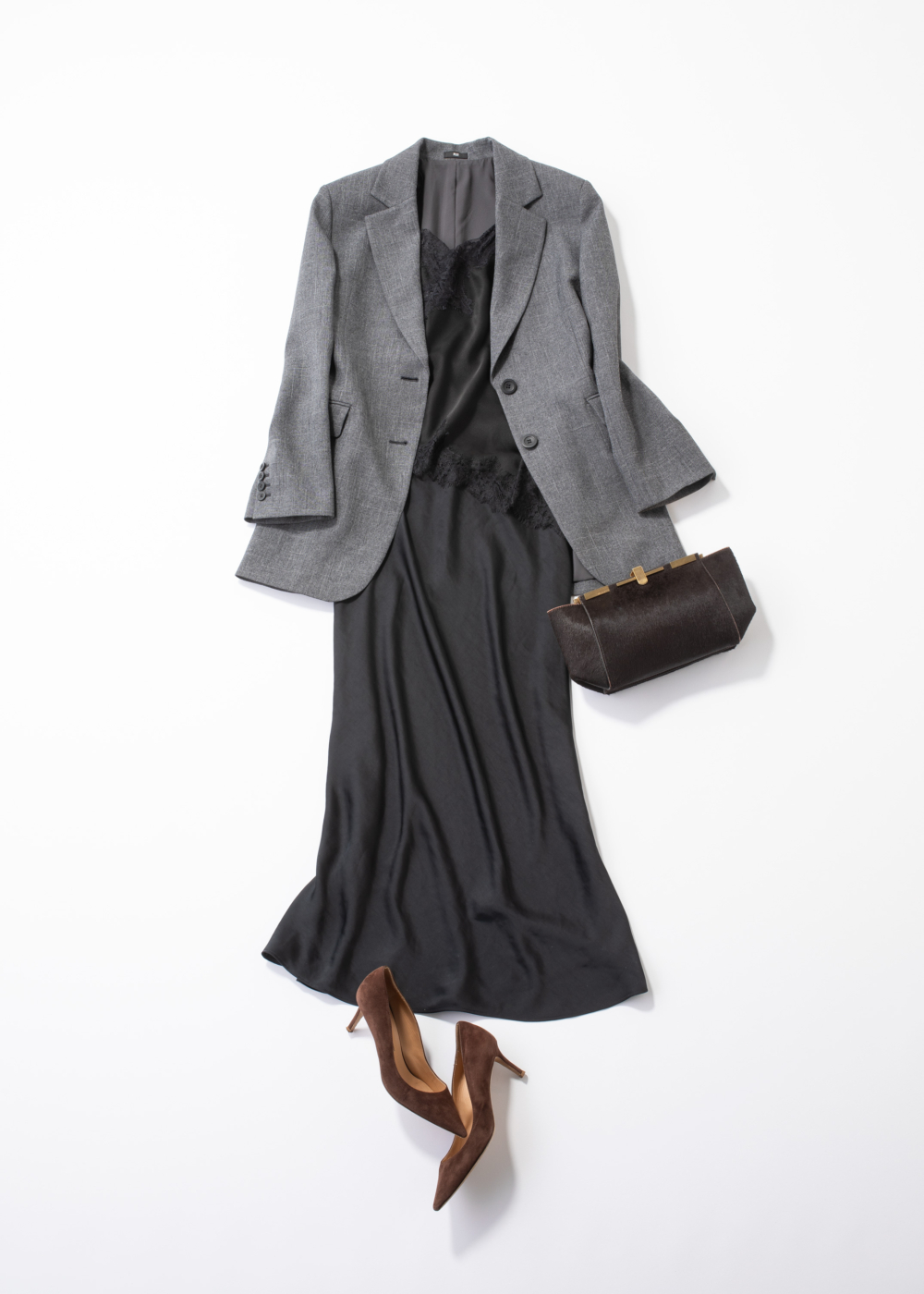 ハンサム×色っぽさのギャップを楽しむのも手。スマートなジャケットがあれば、一枚だとちょっと気後れしてしまうランジェリー風トップスもきちんと感UP。オーバーサイズテーラードジャケット¥24,000スカート(ともにプラステ)その他・ライター私物