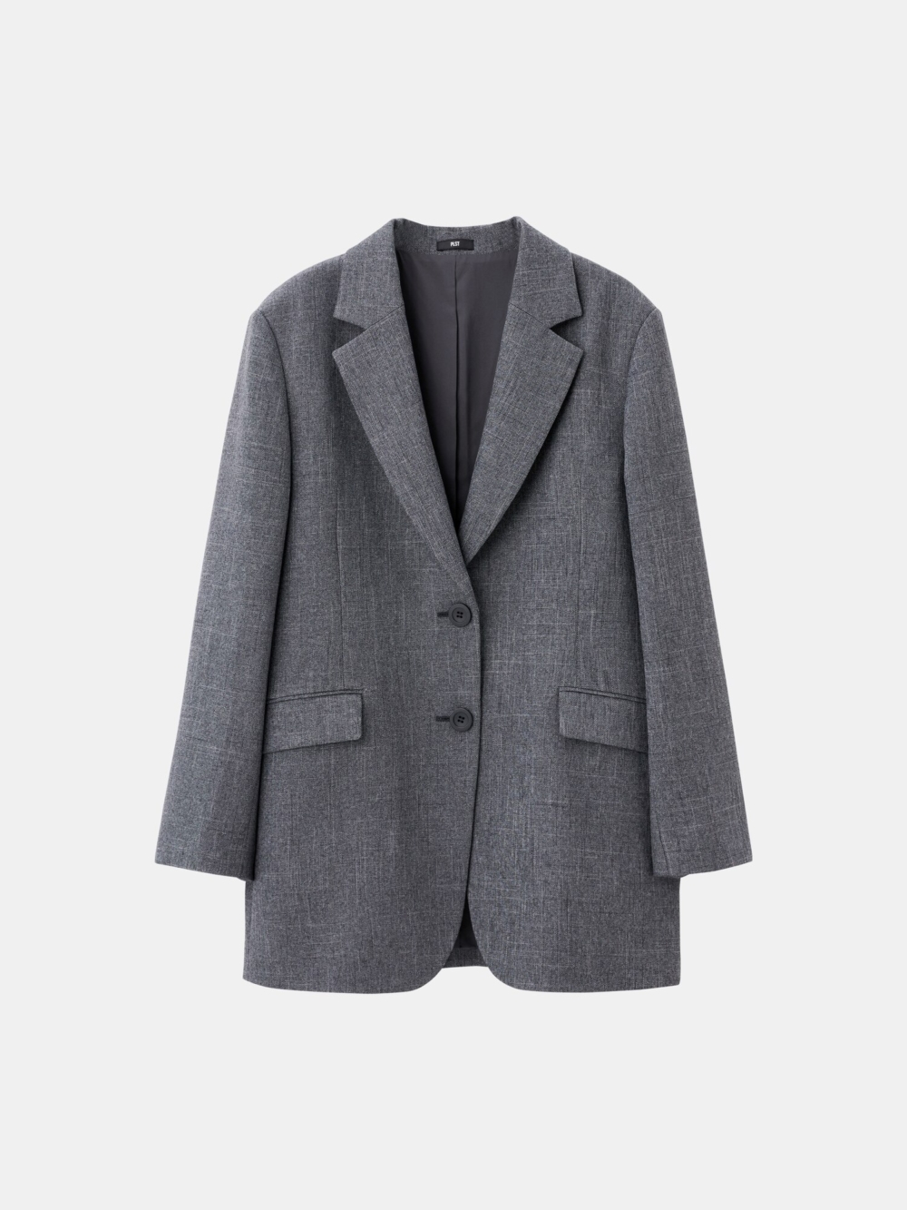 ほんのり表情のあるウール風のポリエステル素材で、軽やかな着心地ながらも重厚感たっぷり。全体的に大きいボックスシルエットだから、厚手のニットやスウェットに重ねてももたつきにくく、インナーダウンも仕込めます。袖口はボタンの付いた本切羽開きになっていることで、折り返したときもオシャレ。マシンウォッシャブルかつ、シワになりにくいイージーケア仕様も魅力。オーバーサイズテーラードジャケット¥24,000(プラステ)