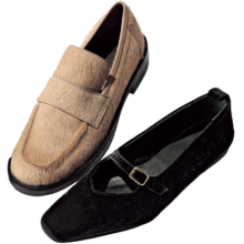ゴム仕様の履き口やクッション性のあるインソール、ほんのり末広がりのチャンキーヒールで、パンプスとは思えないほど快適です。ややスクエアシルエットのつま先によってシャープになりすぎず、甘めコーデからコンサバスタイルまで幅広くマッチ。クシュっとしたギャザーデザインが目を引きますが、足を入れると生地がピンと張るので、きちんとシーンにもうまくなじみます。ギャザーヒールパンプス¥11,000(プラステ)