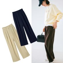 一見スウェットパンツ風ですが、温かみのあるメルトン調のジャージー素材を使用。チクチクしにくいなめらかな肌触りで、起毛を施したウールのような風合いです。ストレッチ性があり動きやすく、洗濯機洗いOK&洗濯後もシワになりにくく、お手入れが簡単なのもうれしいポイント。ウエストはゴム仕様ですがベルトループ付きで、きちんと感をキープできます。プレシャスニットメルトンイージーワイドパンツ¥12,000(プラステ)