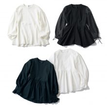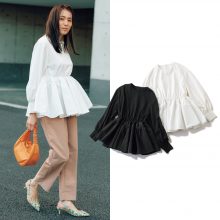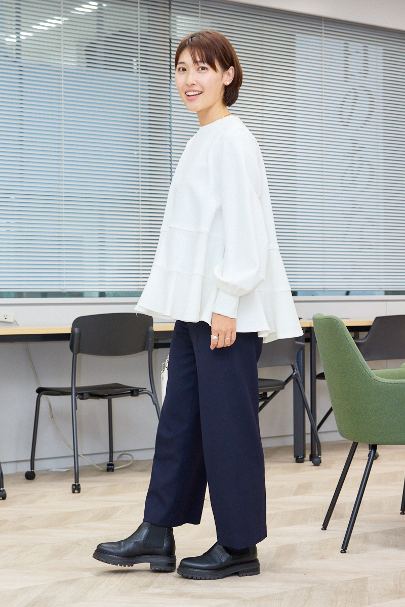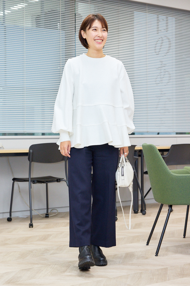 「華やかブラウスを主役にしたホワイトコーデにしました。腰の位置でキュッと絞られややペプラムになっていて、レースのあしらいがたっぷりだからこれ1枚でコーデが完結します。ブラウスはレイヤードしやすい厚すぎない生地で、上からジャケットを羽織るのはもちろん、ニットやカーデにインしてもかわいい。首元と袖口のフリルをニットから覗かせたらレースがポイントになってかわいいんです。」編集菅原圭絵さん・35歳(5歳の女の子ママ)