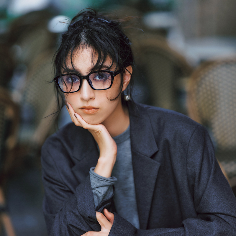 眼鏡¥17,500(ブラックキャット) ジャケット¥99,000(エイトン/エイトン青山) ニット¥39,600(バッカ/ビー エディション ニュウマン新宿店)