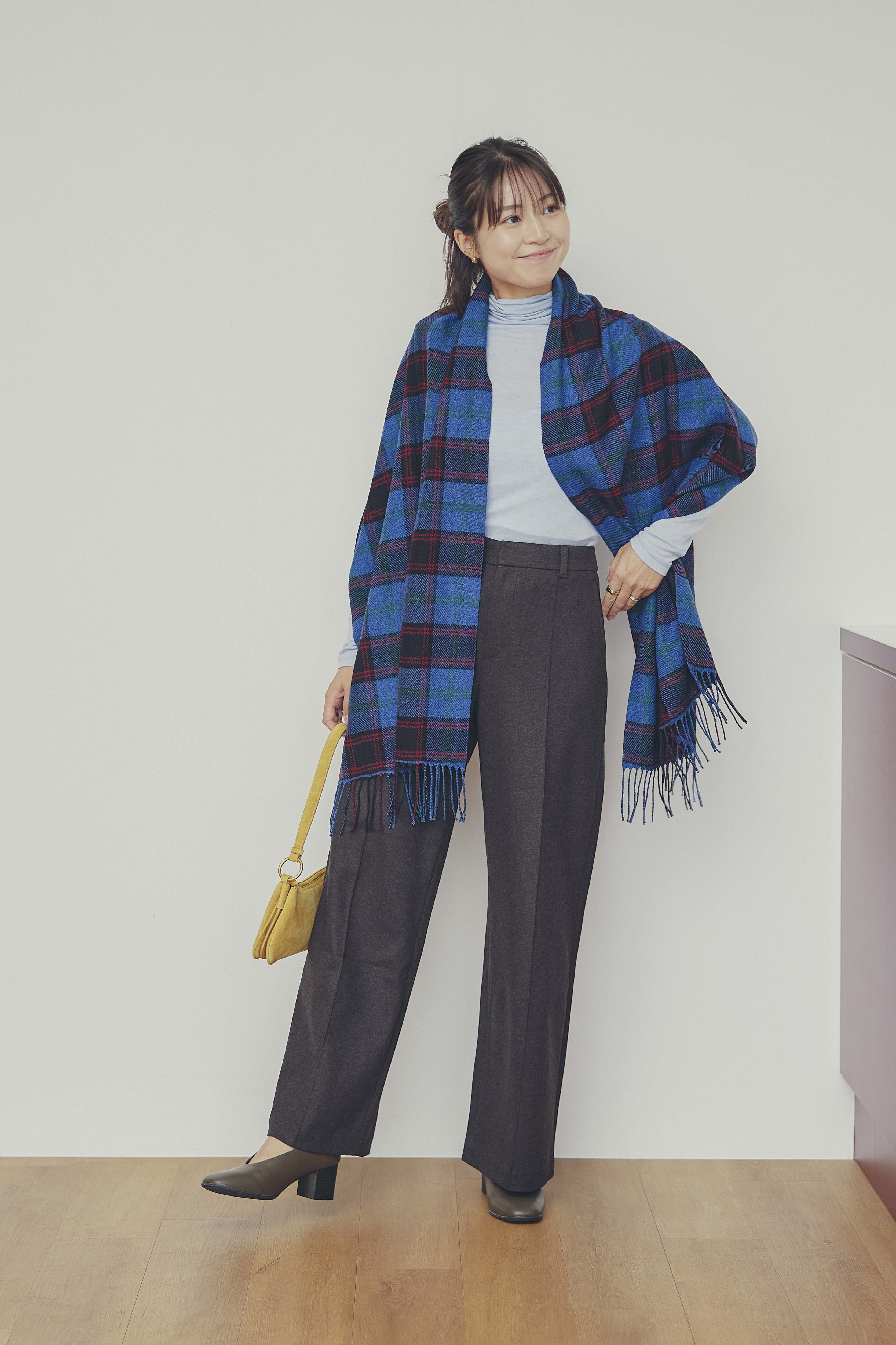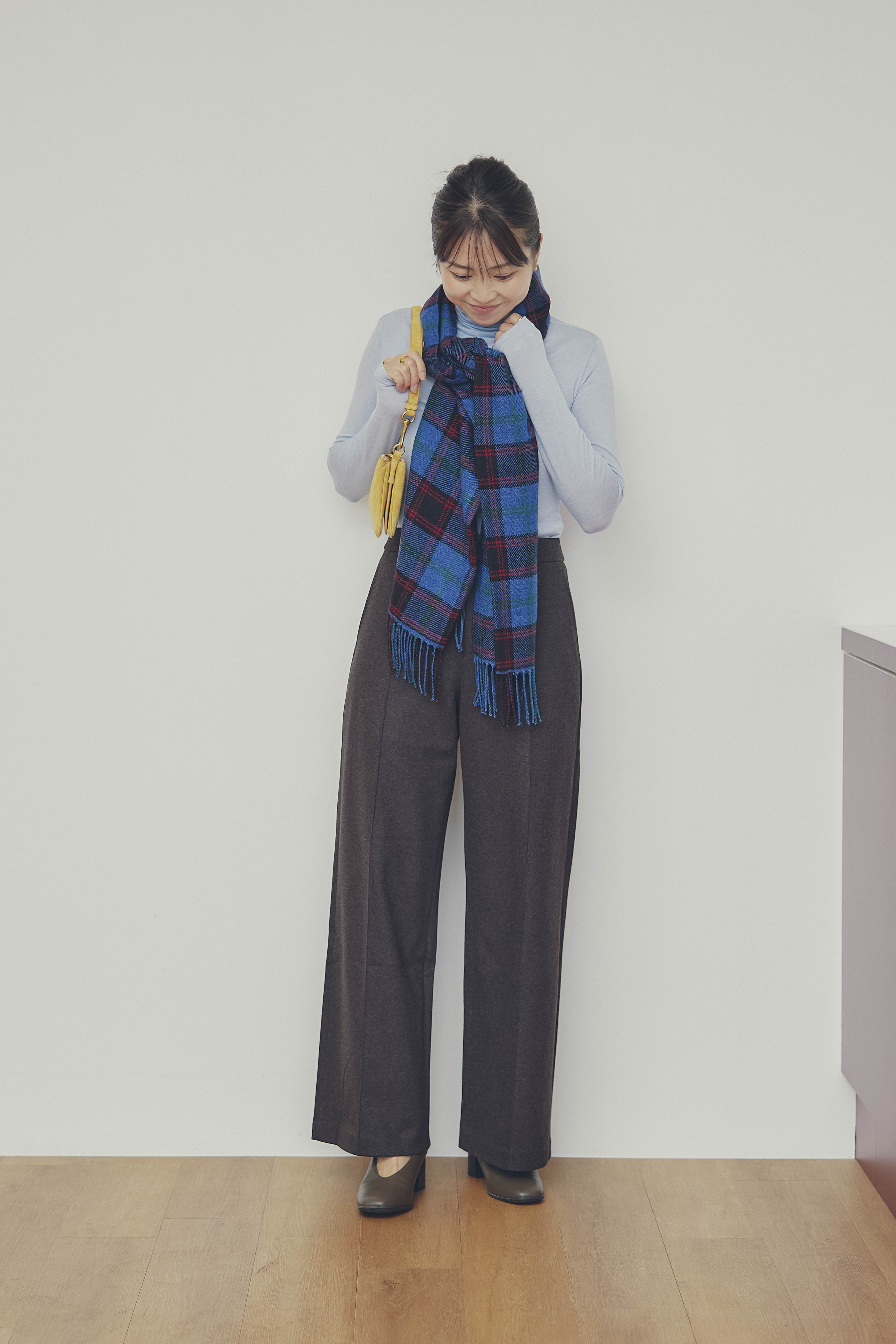 柔らかく起毛したブラウンのワイドパンツに、ヒートテックマフラーをふんわりひと巻き。温度調整しやすく、見た目にも季節感のあるスタイルに。カシミヤブレンドの上質なタートルは洗濯機で洗えるから、デイリー使いにも最適。トレンドのブラウンをベースに、ブルーを差すことでぐっと華やぎいつもの着こなしが新鮮に。