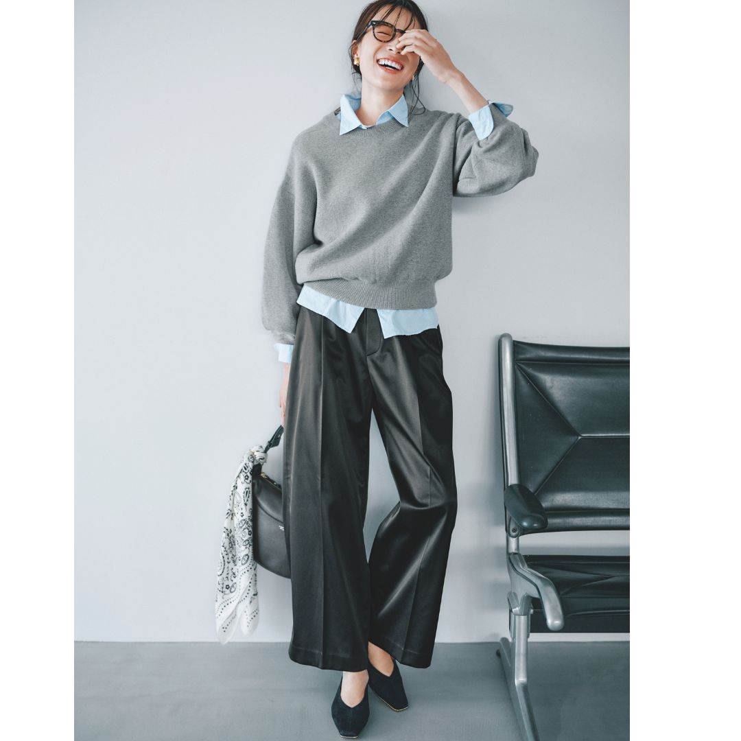 ニット¥14,960~16,060パンツ¥19,910~21,010(ともに組曲/ オンワード樫山お客様相談室)シャツ¥33,000(スローン/ ザ ショップスローン 神戸)バッグ¥33,000〈ロウェル シングス〉パンプス¥20,900〈オゥ バニスター〉(ともにアバハウスインターナショナル オンラインストア)スカーフ¥22,000(マニプリ)めがね¥49,500(モスコット/ モスコット トウキョウ)イヤリング¥11,000(アビステ)