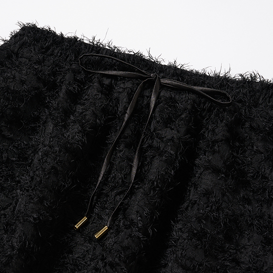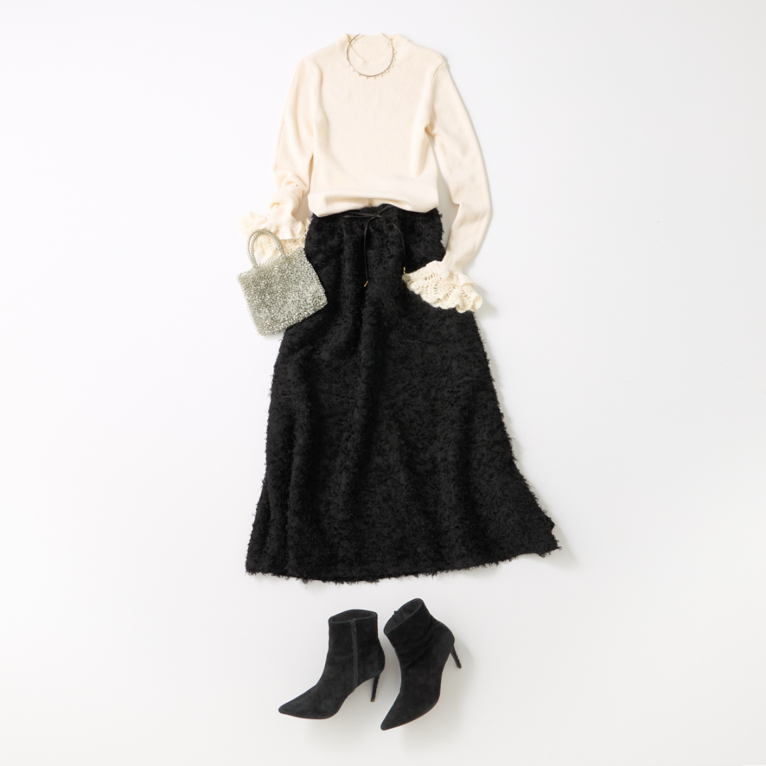 シャギー×ジャカードの異素材コンビが目を惹くスカートは、穿くだけで華やぎとリッチ感がUPする一枚。ウエストはゴムになっていて、楽ちん仕様なのもうれしいポイント。子ども抜きで参加するママ友との忘年会など、華やかなオシャレを楽しみたい日には、白ニットや甘小物と合わせると◎。黒ベースなので、甘さをほどよく引き締めて大人っぽいバランスに仕上がります。週末の子どもとのお出かけには、スニーカーでカジュアルダウンすれば抜け感のある甘カジュアルに。ロングシャギージャガードスカート¥19,800(VERSEAU)