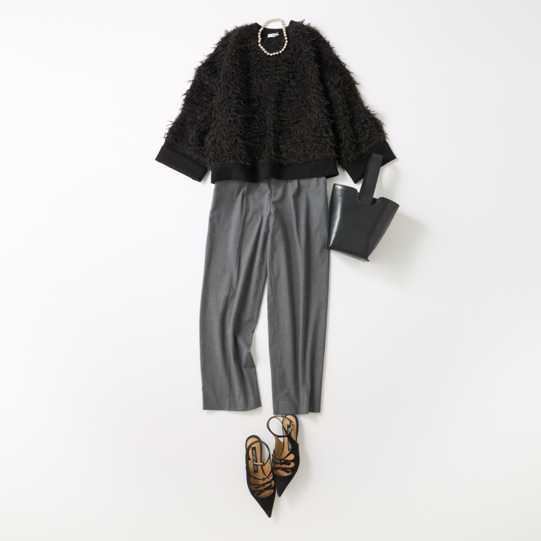 ふわっとしたシャギーのトップスは、着るだけで盛れる着映えアイテム。衿・袖口・裾にはシャギーをあえて入れないメリハリのあるデザインで、すっきりと大人っぽく着られるのが魅力です。グレーのきれいめパンツと合わせれば、通勤にも最適な上品スタイルに。そのまま忘年会に参加する日は、パールネックレスをプラスワンするだけで華やぎが加速します。シャギープルオーバー¥16,500(ALERGE)