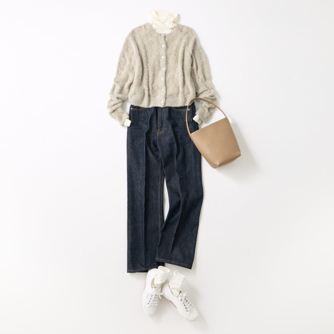 羽織りとしても、トップスとしても着られるラメニットカーディガンは、暗くなりがちな冬のコーデを華やかにしてくれる万能アイテム。シャンパンゴールドのきらめきが効いて、いつものデニム合わせが新鮮に。寒い日の公園でも気分が上向く上品カジュアルが完成します。ブラウス×スカートにチェンジすれば、クリスマス会などのちょっとしたイベントにも◎。ラメニットカーディガン¥14,300(UNIVERSAL OVERALL)