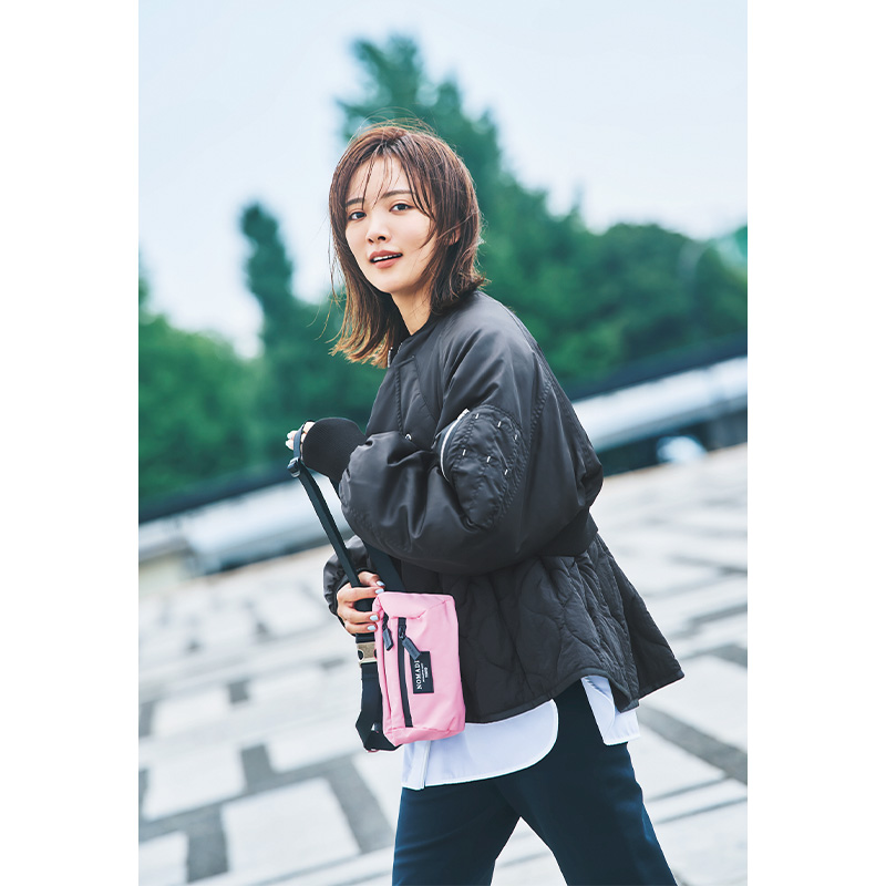 公園だって自分らしいオシャレは楽しみたいから、MA-1のモードなエッジは残しつつ、ふんわりAラインに広がるシルエットで軽やかな印象に。ハードに見えがちな黒ブルゾンも、一気にソフトなニュアンスに昇華。ピンクの小物も、モードブルゾンの都会的な雰囲気に可愛げをプラス!