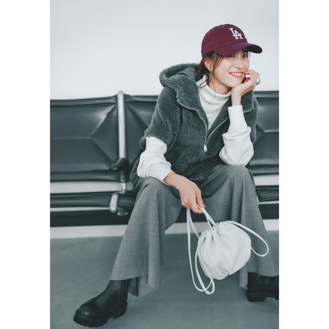 ジレ¥24,200(リナージオ)タートルニット¥34,100(スローン/ザ ショップ スローン 神戸)パンツ¥44,000(ソブ/フィルム)バッグ¥35,200(ロー ソウル)ブーツ¥38,500(カミナンド/グラビテート)キャップ¥4,620(ニューエラ)ピアス¥13,200(アビステ)リング¥51,700(バルブス/ZUTTOHOLIC)