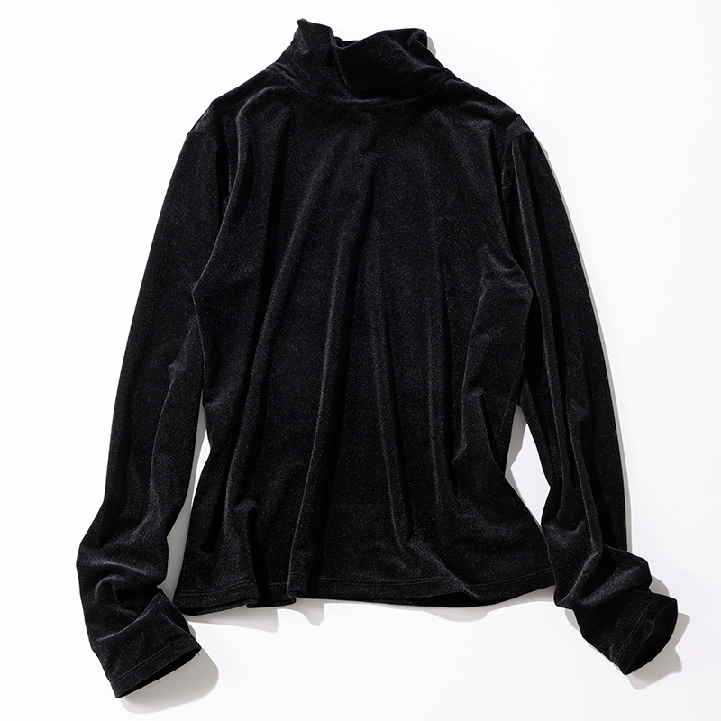 ベロアの微光沢で秋冬ムードを高める一枚。トップス¥9,900(セルフォード/セルフォード ルミネ新宿2店)