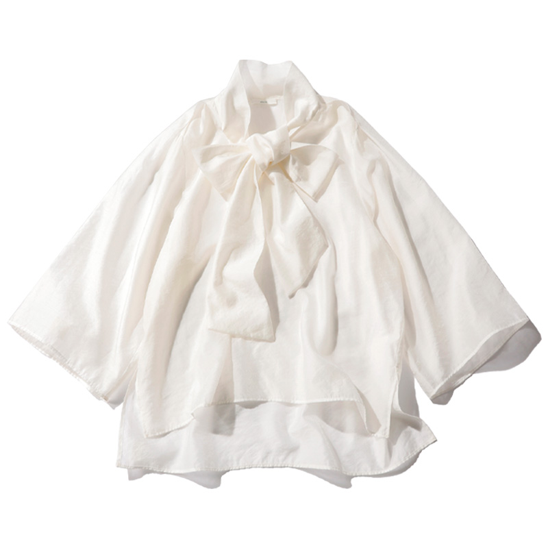ボウタイを垂らしたり、片結びしたりとアレンジ自在。ブラウス¥39,600(ebure/リトルリーグ インク)