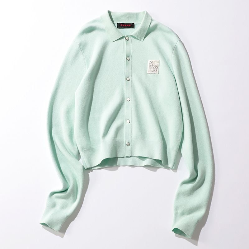 小ぶりなポロ衿とパールロゴがエレガント。カーディガン¥44,000(キャバン/キャバン 丸の内店)