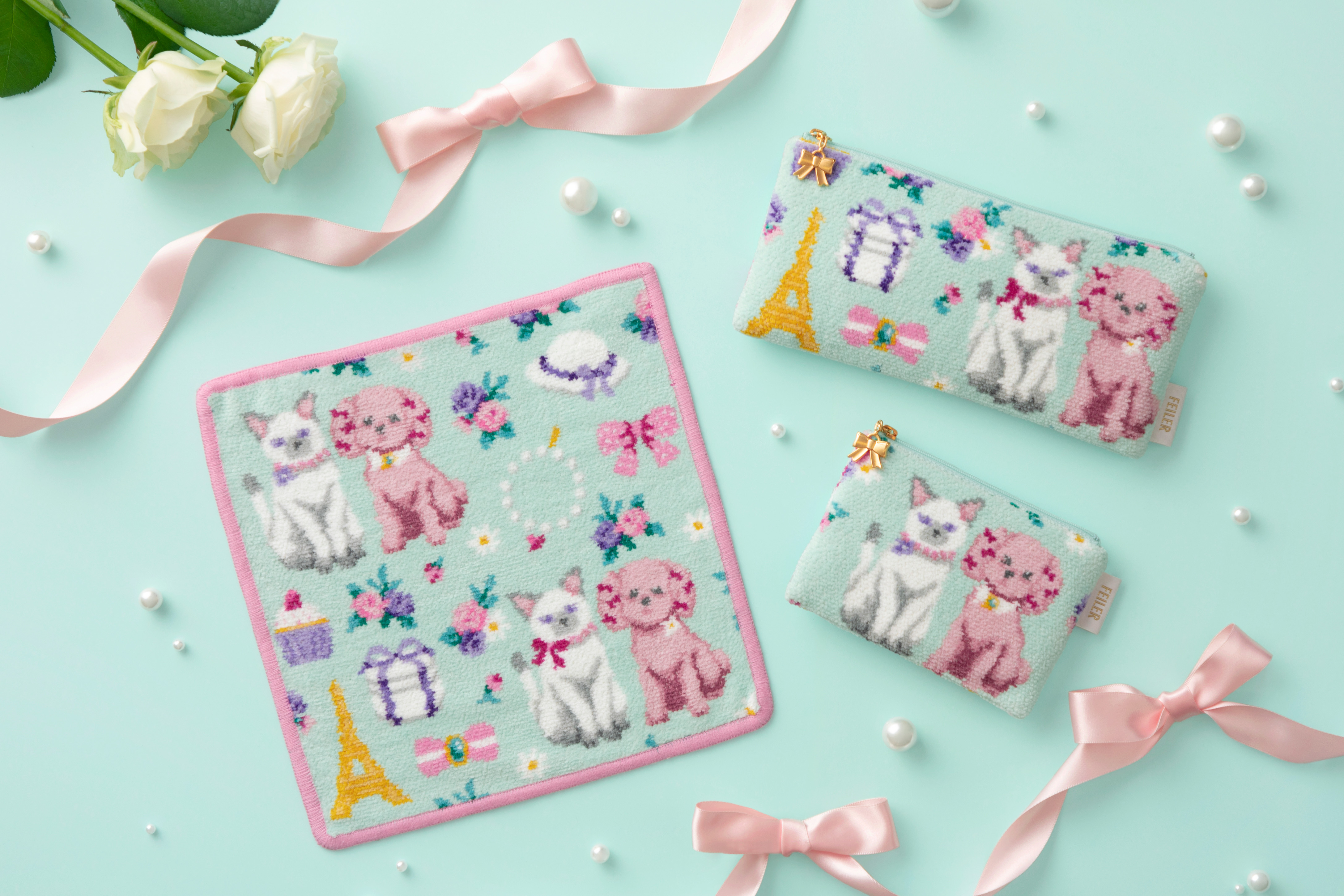ハンカチは、グリローズのブランドキャラクターである猫のペルルと犬のボンボンがパリの街を散策しているおしゃまなデザイン。エッフェル塔やネックレス、リボンにお花と、ロマンチックなモチーフを詰め込んだ1枚で、親世代もときめき不可避! ランドセル選びの思い出に、入学や誕生日といった「大人に一歩近づく日」の小さな記念に、親子で持ちたくなる仕上がりです。縁取り部分がパープルのもの、ピンクのものの2色展開。