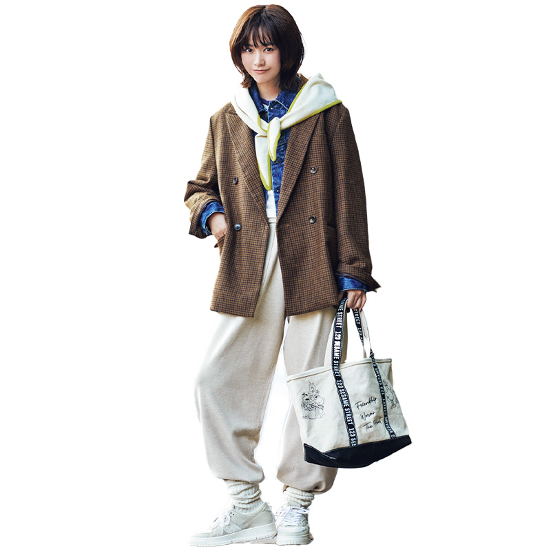 チェックジャコット¥19,998(N.ナチュラルビューティベーシック/N.ナチュラルビューティベーシック二子玉川ライズS・C店)スウェット©Cheryl Dunn¥14,300(ハチイチブランカ/UTS PR)レギンス¥16,500(アメリカーナ フォー サロン/サロン アダム エ ロペ)フードストール&アームウォーマーセット¥17,600(アダム エ ロペ)バッグ¥5,995(フリークス ストア/フリークス ストア渋谷)ソックス¥1,320(靴下屋/タビオ)スリッポンスニーカー¥16,500(アディダス オリジナルス/アディダス コールセンター)