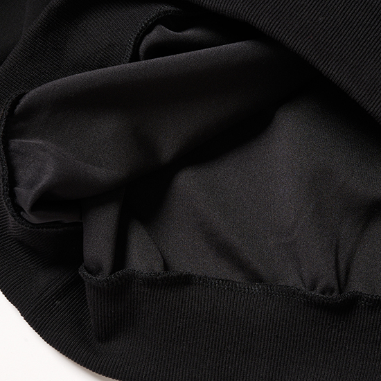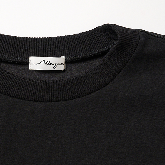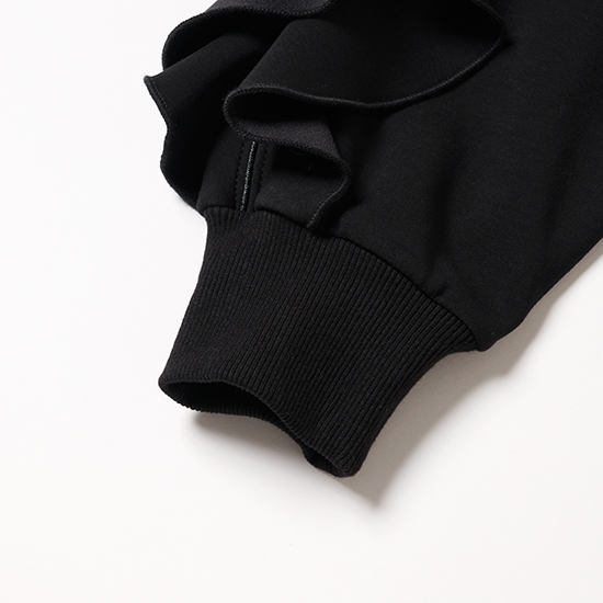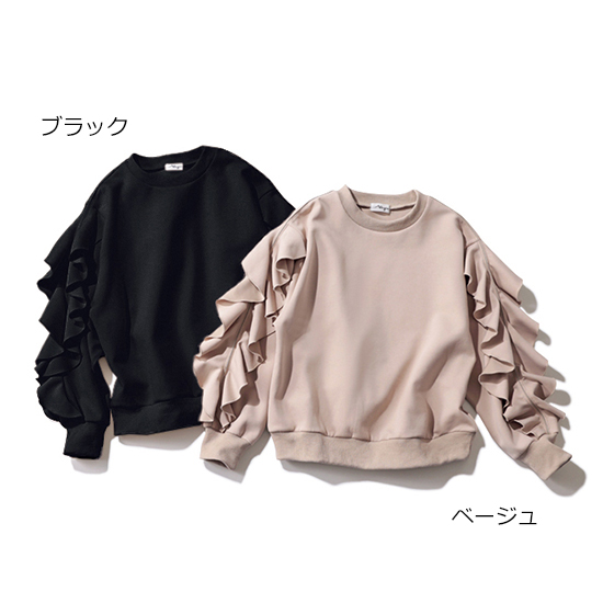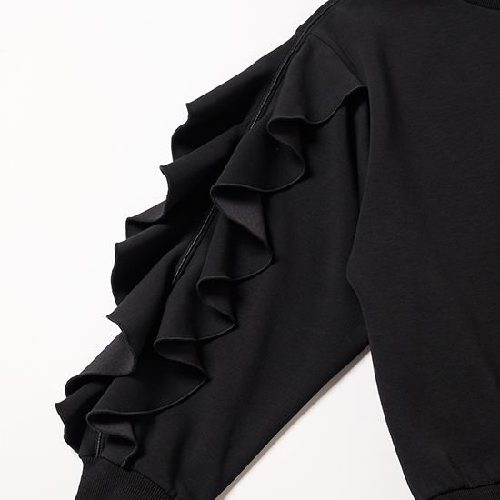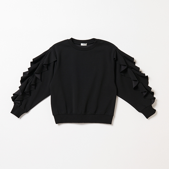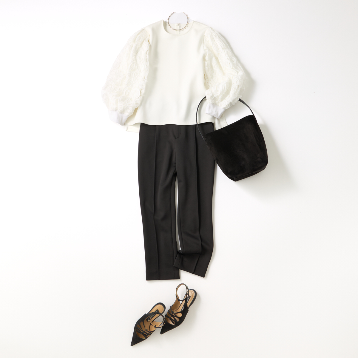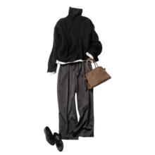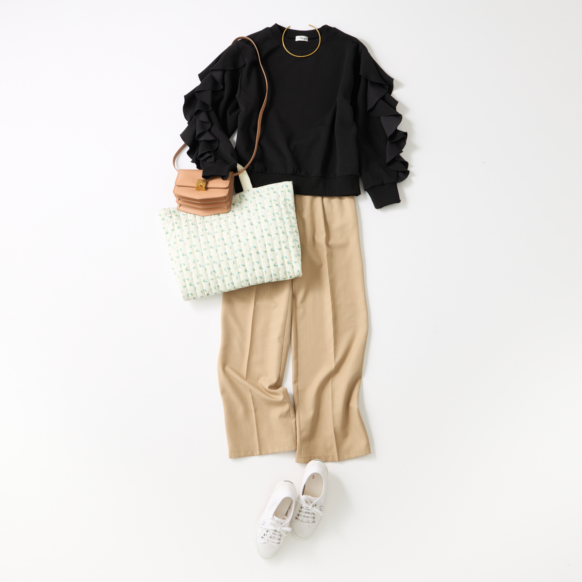 袖フリルが華やかなトップスは、実はスウェット素材の楽ちんアイテム。黒なら甘さがほどよく引き締まり、大人っぽい印象に。年末の帰省など親戚との集まりがあるシーンには、ベージュパンツを合わせてきちんと感をプラス。黒×ベージュのきれいめ配色なので、足元は移動を考慮したスニーカーでも品良くまとまります。フリルスリーブスウェット¥13,200(ALEGRE)メルトキルティングレッスンバッグL¥5,500(AJUGA)