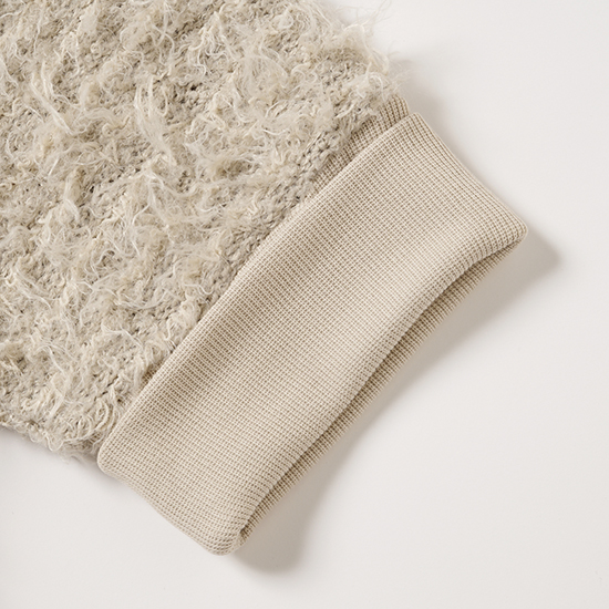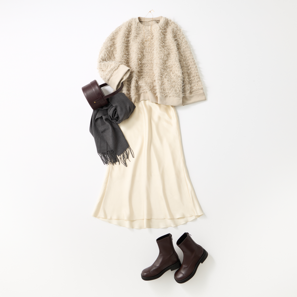 シャギートップスは、着るだけで季節感やイベント気分が高まるアイテム。ベージュを選べばふわふわのシャギーが肌になじみ、ほどよく華やいで、柔らかい印象に。ちょっとオシャレしたいママ友ランチ会にもぴったりです。靴やバッグはブラウンでまとめて、今年っぽさをプラス。きれいめなテーパードパンツにシンプル小物を合わせれば、年末の挨拶など、品良く見せたいシーンでも活躍してくれます。シャギープルオーバー¥16,500(ALEGRE)