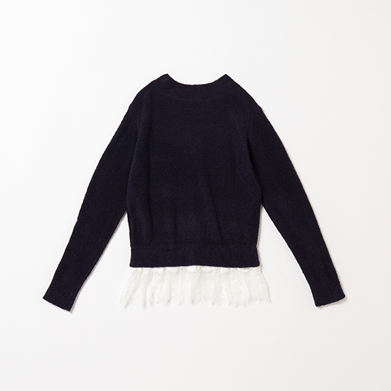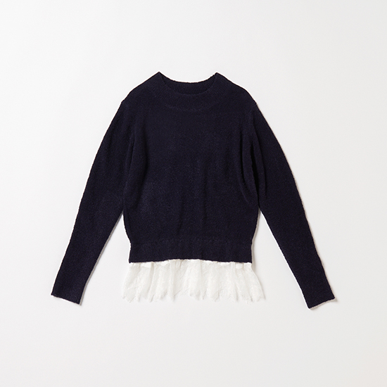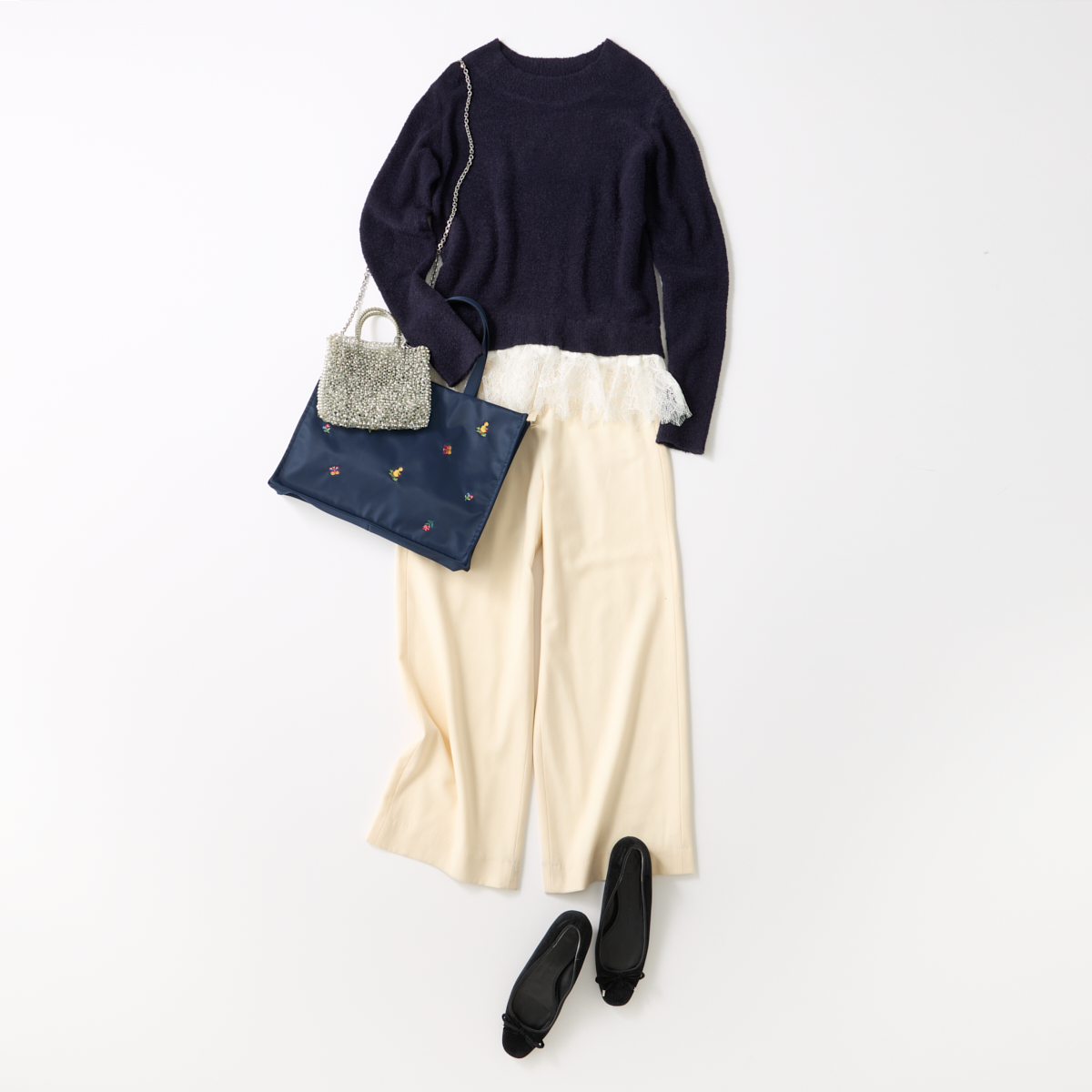 レースが重なったレイヤード風ニットは、シンプルになりがちなニットコーデにほんのり甘さをプラスしてくれます。アイボリーのパンツを合わせれば、清潔感ときちんと感が両立し、少し緊張するママ友宅でのホームパーティでも好印象を約束。ヒップまで隠れる丈で、しゃがんだり抱っこしたりするシーンでも安心して過ごせるのもうれしい。レースレイヤードニット¥15,400(VERSEAU)
