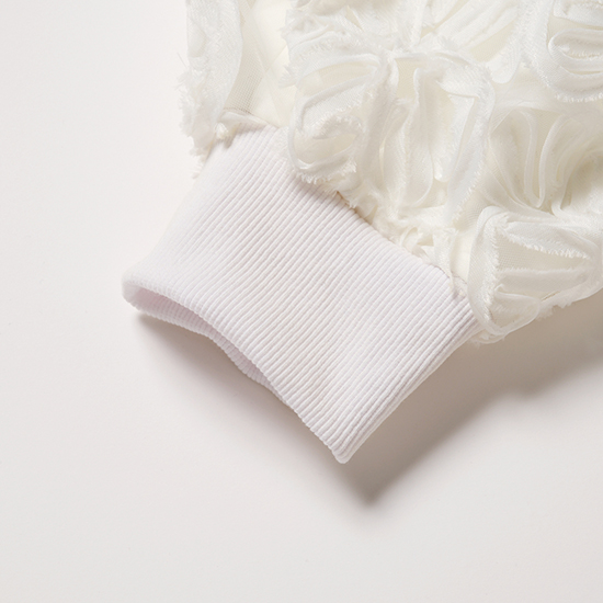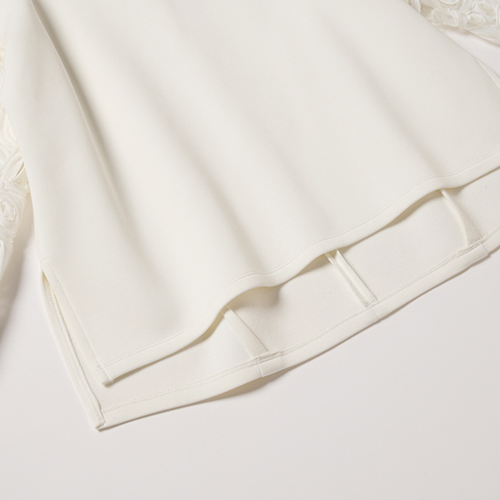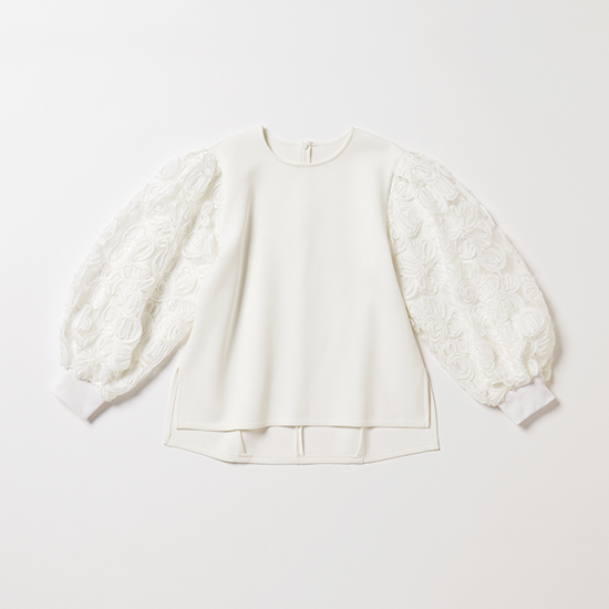 袖のフラワーチュールレースが華やかな白トップスは、身頃がすっきりしているので大人でも着やすい一枚。袖は透け感のあるシアーデザインですが、裏起毛で暖かさもばっちり。定番の黒パンツを合わせるだけで、簡単なのに手抜きに見えないきれいめなワンツーコーデが完成。子どもと過ごす週末は、デニムに替えてカジュアルダウンすれば、甘派ママも気分の上がる、ちょい甘カジュアルを楽しめます。袖レース裏起毛プルオーバー¥14,300(ALEGRE)
