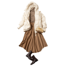 高めの位置でウエストを絞れるデザインで、自然とメリハリが生まれるキルティングコート。ファスナーを上まで閉めれば、ぽわんとした甘めの袖とノーカラーのすっきりさが際立ち、グっと上品な印象に。ベージュのタートルにきれいめパンツを合わせるだけで、園行事や通勤などのきちんとしたシーンにもぴったりなコーデが完成。シンプルな配色でも、美シルエットのおかげで洗練された着こなしに仕上がります。