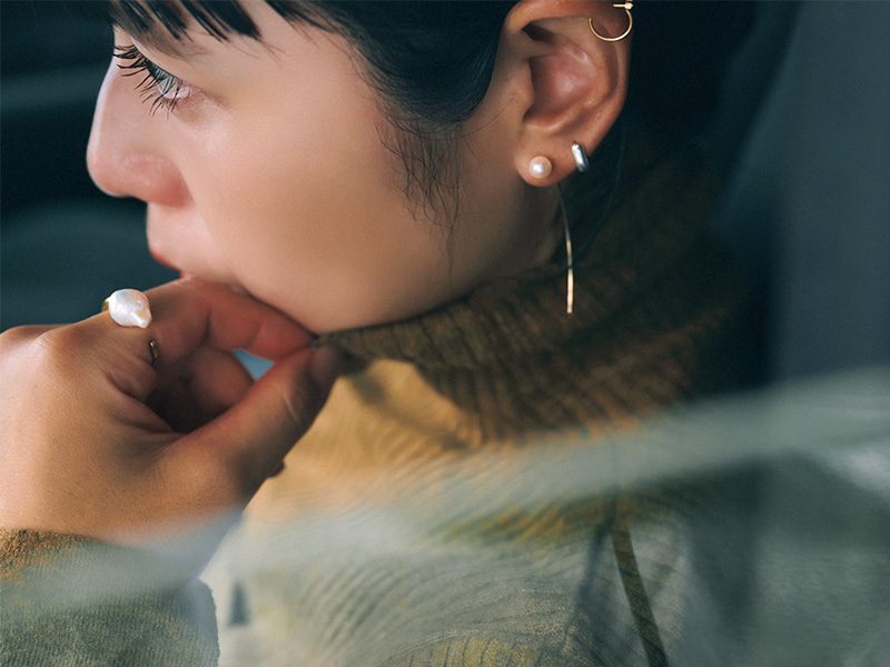 「イヤカフとしても使えるバロックパールのゴールドリングはフィブラというジャパンブランドで購入。パール/ゴールド、どちらの面を見せるかで印象が変わる汎用性の高さも愛用の理由です。ピアスはHirotakaのアシンメトリーなパールピアスで手元とのさりげないコーディネート感を。パールはあえて脱コンサバなデザインでシンプル服を盛り上げるのがお気に入りです」