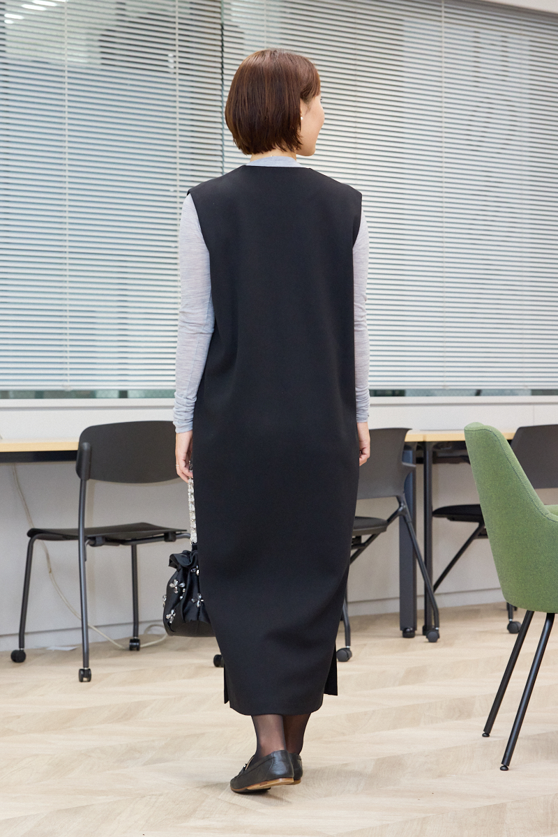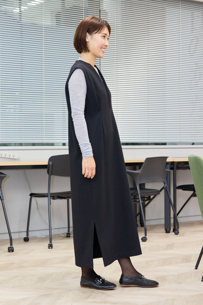 「深めのVネックと、胸下に入った立体的なタックで細見え効果のあるワンピースは、グレーのインナーを合わせてかしこまりすぎない雰囲気にまとめました。幼稚園の発表会や懇談会後はそのままランチ会になることが多いので足元は歩きやすいローファーに」ライター小川理蓉さん・36歳(158cm/8歳、7歳、3歳の男の子ママ)