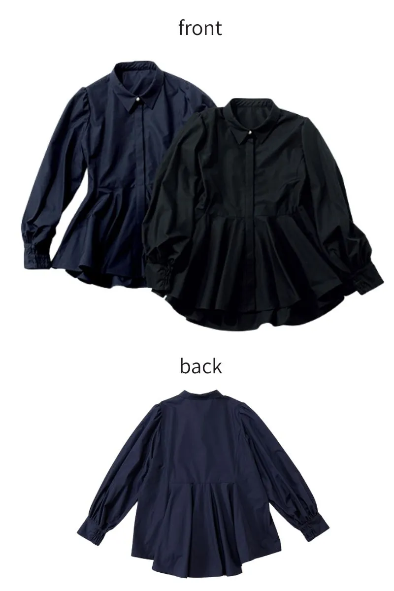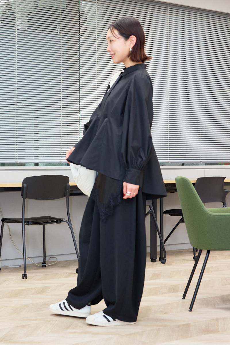 「首元のパールボタンが品良く見えて、ネックレスいらずなのがありがたいブラウス。母業でも自分らしい要素を取り入れるコーデを意識していて、ブラウスの下にレースのインナーを仕込みました。校内に入ってしまえば靴を脱ぐのでスニーカー合わせでも大丈夫。年中頼れるペプラムブラウスですが、今の時期にはオール黒でカッコよく着こなすのが気分です」ライター高萩里奈さん・39歳(165cm/11歳、7歳の女の子ママ)