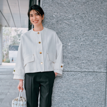 「娘の保育園はラフな格好のママが多いので、私もあまりカッチリしすぎないよう意識しています。むしろ、トレンド要素を取り入れたファッションで、気の合うママ友との会話のきっかけになったらなと思ったり。ジャケットできちん感を出しつつ、ボトムスやバッグで洒落感をプラスできたらと思ってコーディネートしてみました。特にレザー風のワイドパンツは今年っぽさ抜群。やわらかくて伸びがよく、ウエストゴムで楽ちんな着心地だから動きやすいんです。足元はローファーにして抜け感を出してみました」ライター降籏咲子さん・33歳(164cm/3歳の女の子ママ)