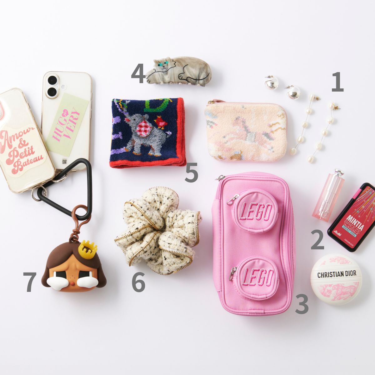 「アクセ感覚の小さめバッグを持ちたいとき、入りきらない荷物用にサブバックは必需品。ママ友に〝それどこの?〟と聞かれそうなラメクローバー柄も、ネイビー面もどちらも使えそう! 1.アクセは持ち歩き派。シルバーボールピアスはH&M、5連パールピアスはmaayaのものをフェイラーのポーチに入れて。2.(上から)ディオールアディクトリップグロウ、フリスク、リップ&ハンドクリームとしても使えるディオールのルボームの3点セットはお出かけの必需品。3.バッグの中が整理されるように1.2.をレゴランドで買ったポーチにまとめて。4.ククシュゼットのヘアクリップ、5.フェイラーのハンカチの動物モチーフに癒されます。6.Tuno by Azumiのシュシュならまとめ髪も華やかに。7.社用と私用携帯、両方持ち歩き忘れないようにカナビラで連結。イヤホンケースにしているCRYBABYがお気に入りです。」菅原圭絵(VERYweb編集/長女5歳)