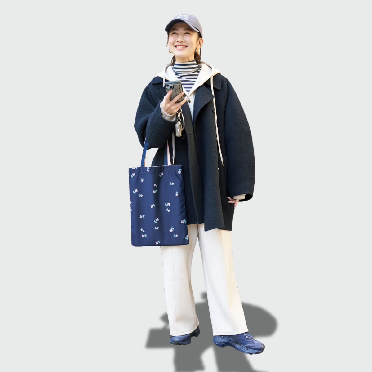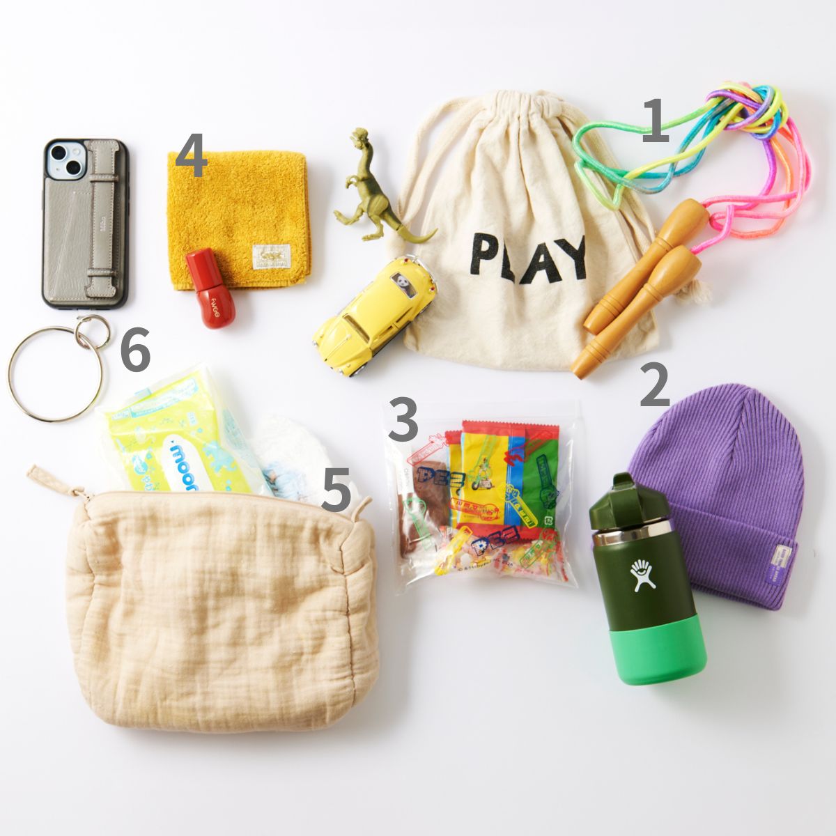 「華やかな総柄がネイビーパーカのカジュアルな装いにアクセントに。スマートな見た目に反してたっぷりな容量サイズが公園シーンでも大活躍の予感です! 1.次男のミニカーと恐竜、長男の縄跳びを入れた公園用ポーチ。2.洗うパーツが少なくて便利なハイドロフラスクのキッズボトル(354㎖)、ニット帽は防寒対策&公園内の目印にも。3.おやつはケンカになるので必ず同じものを2つずつ、自分用の焼き菓子も忘れずに(笑)。4.テネリータのタオルはバッグの中でも見つけやすい目を引くマスタードカラーがお気に入り。5.ZARA HOMEのポーチを次男のオムツ入れに。嵩張るオムツポーチも余裕で入りました!6.公園の時はお財布を持たずにスマホのみ。cache cacheのバッグについていたハンドリングをスマホケースに付けています。」大和美帆さん(VERY STOREバイヤー/長男6歳・次男2歳)