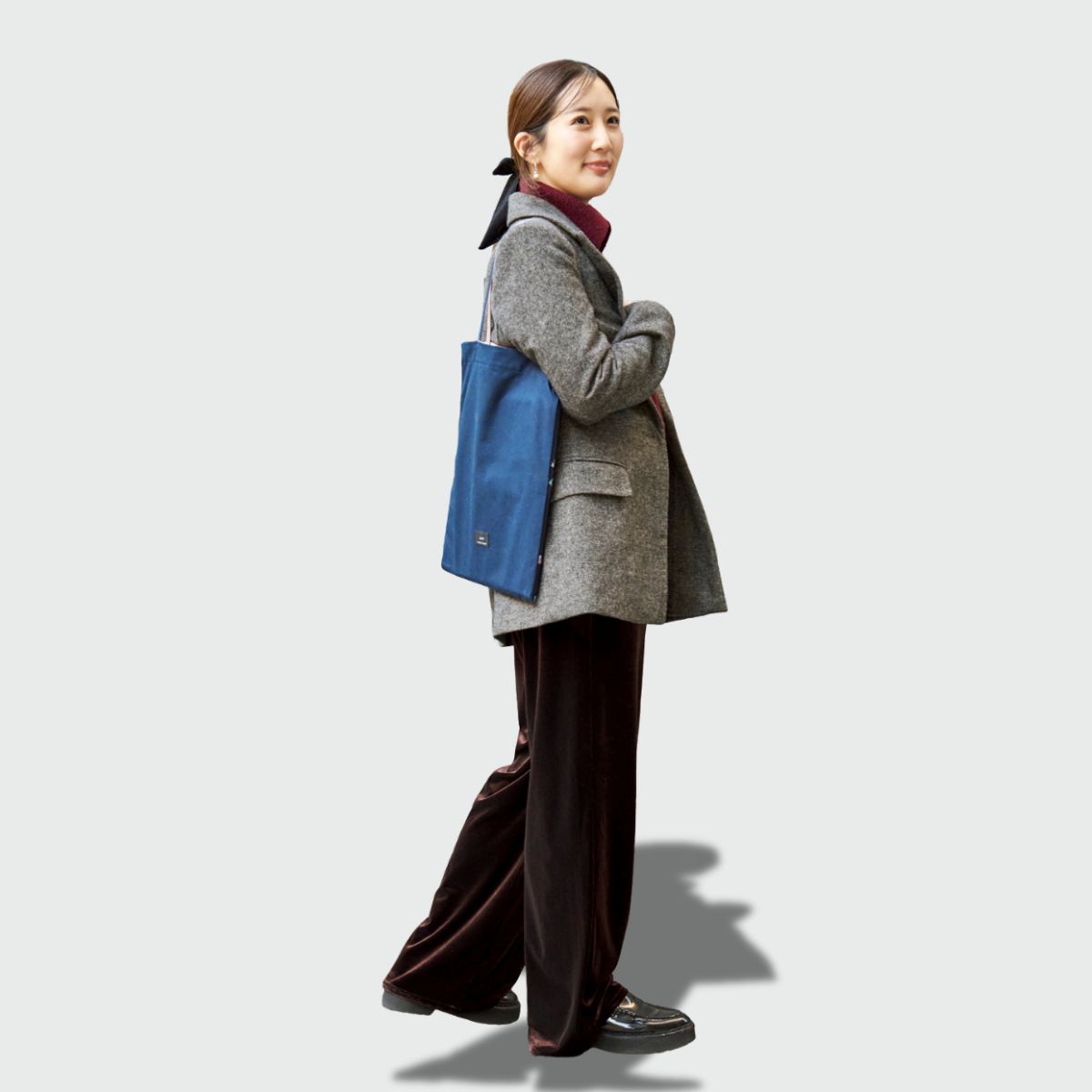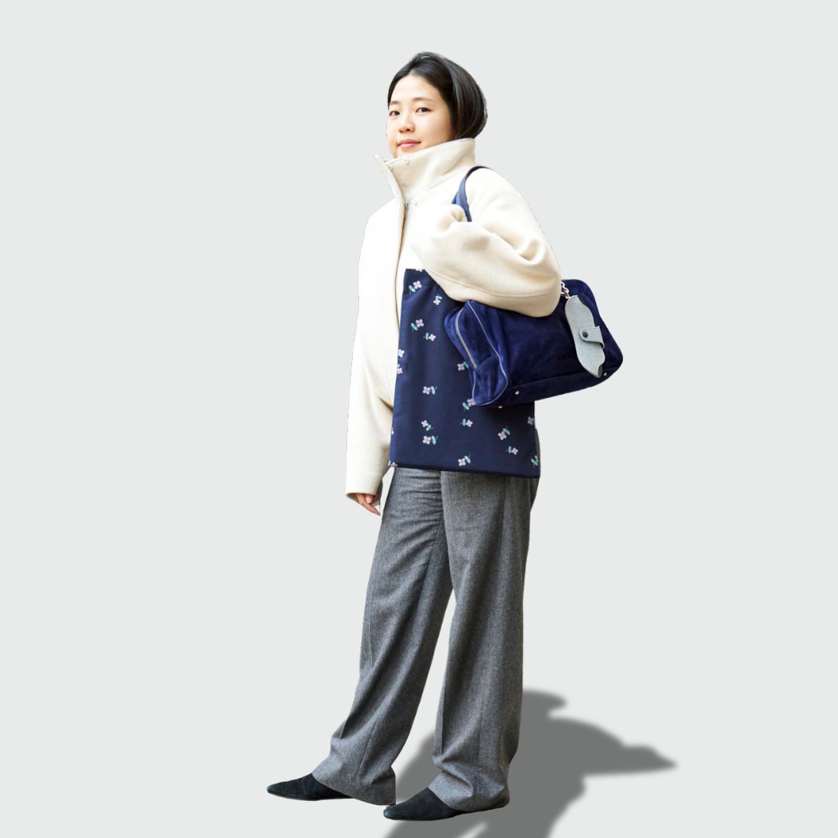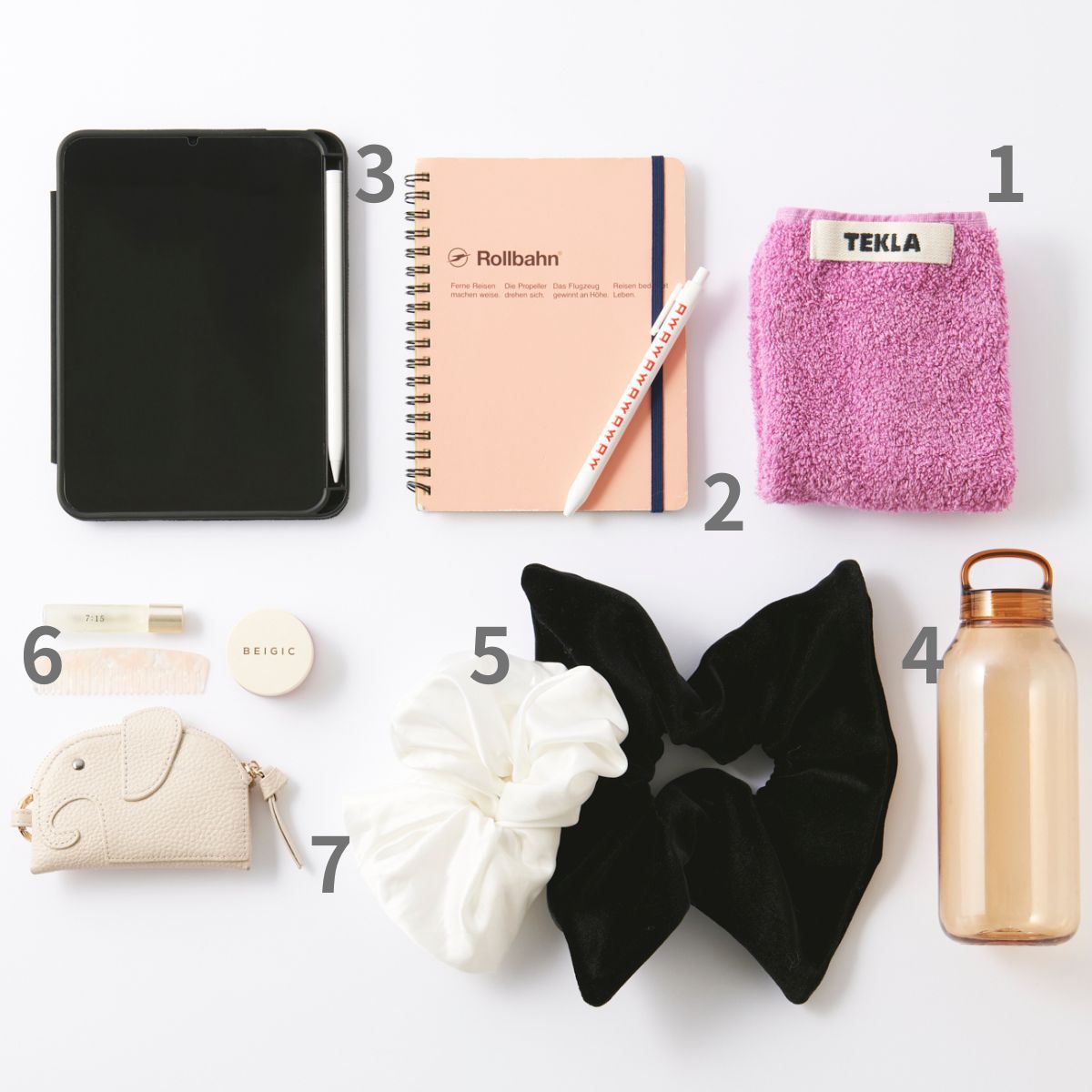 「幼稚園の参観日や係の打ち合わせでは、外側にネイビー面がくるよう持ち替えてきちんと仕様に。資料や子どもの荷物など、外出先で増ていく荷物もyoriのバッグは収納力ばっちりだから安心! キャンバス生地のしっかり素材だから、これ1つでまるっといけるのも嬉しいポイントです。1.地厚でボリューミーなTEKRAのハンドタオルをいれても嵩張らずすっきり。2.説明会や係の打ち合わせなどをメモしておくロールバーンのノート。3.集合時間より少し早く園に着けたら隙間時間で作業したいので、iPad miniを常に持ち歩いています。4.KINTOの500㎖のウォーターボトルもすっぽり入ります。5.その日の服に合わせて何パターンか常備しているheyepのシュシュ。6.ukaのネイルオイル、ミニ櫛、BEIGICリップ&チークを象さんポーチにまとめて、すぐに取り出せるバッグの内ポケットへ。」川原江里菜(VERYライター/長男6歳)