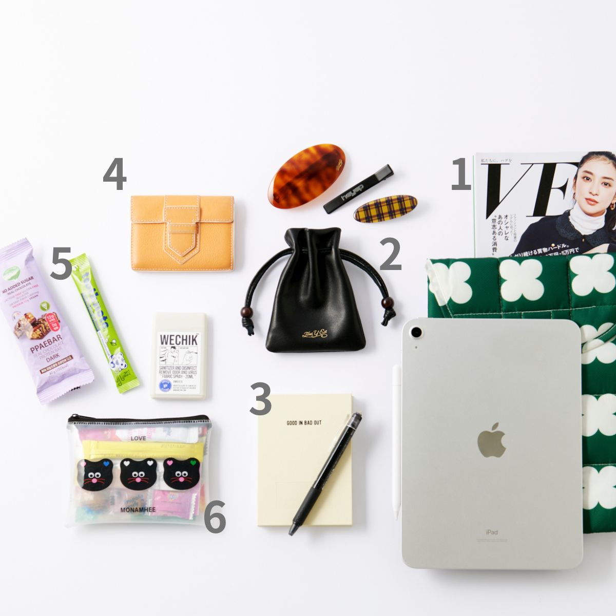 「毎日持ちやすい汎用性と、オシャレの補完にもなる華やかデザイン、どちらも両立できるトートにしたい!と欲張りな編集部からのリクエストを叶えてもらった自信作です。すっきり見える縦型だから、メインバッグとの2個持ちもノーストレス!1.VERYと韓国ブランドのdropdropdropのパフィーなケースにいれたPC代わりのiPadは10.9インチ。バッグはマチなしですが容量は申し分なし!2.トゥティエのバレッタはポーチ付き。heyepの黒ヘアクリップなどを作業中の前髪を止めるピンを一緒にIN。3.韓国土産でもらったPOSITIVE HOTELのノートメモ。4.デルヴォーの名刺入れ。5.右からWECHIKのファブリックスプレー、toothnoteのマウスウォッシュ、オリーブヤングでまとめ買いするPPAEBARのプロテインバーは外出が多い日の必需品です。6.モナムヒのポーチはサプリ入れに。」石川穂乃実(VERY編集)